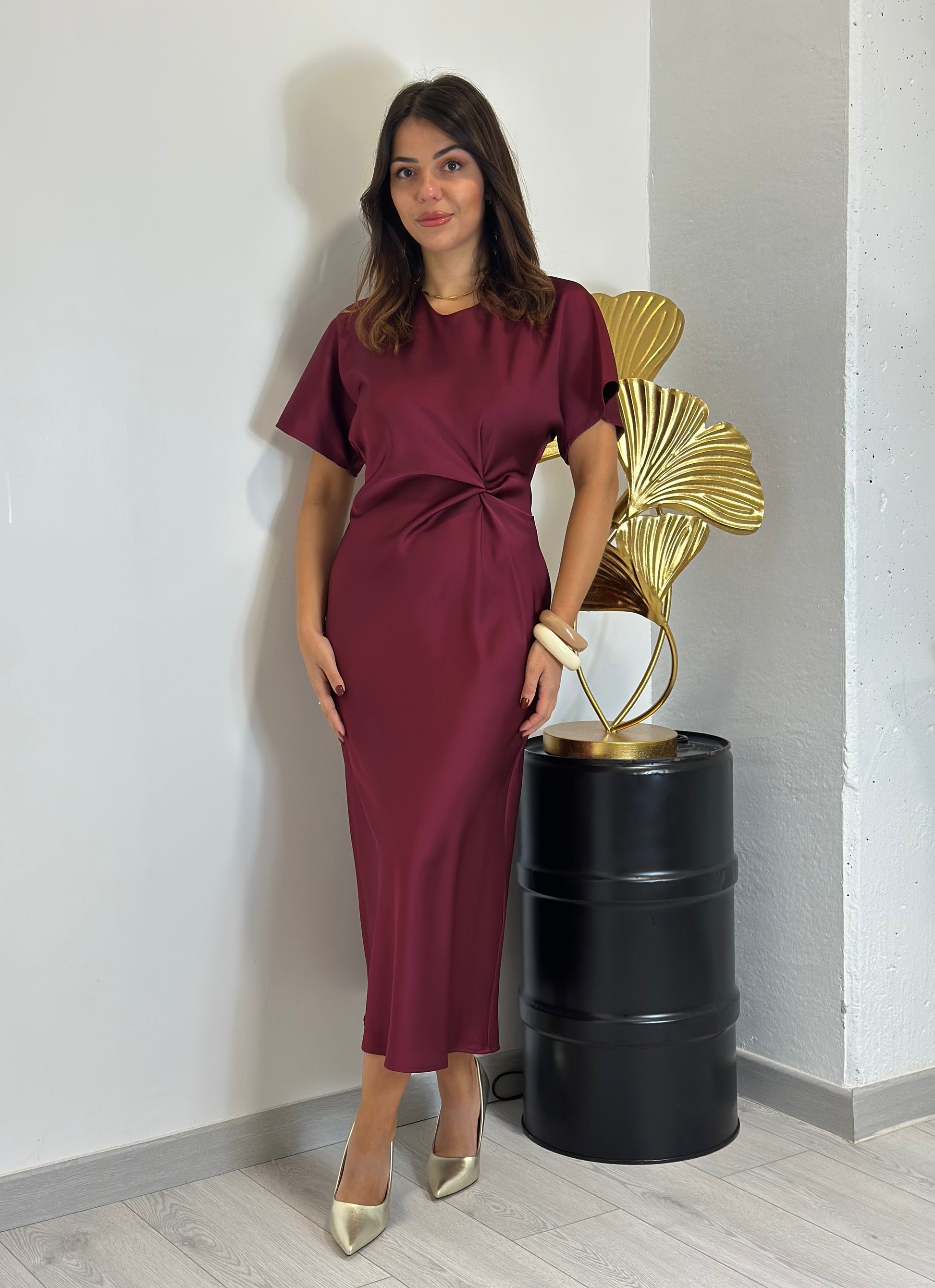 Abito midi dallo stile essenziale e moderno, realizzato in tessuto tecnico fluido con una vestibilità confortevole e impeccabile. Il dettaglio drappeggiato sul punto vita valorizza la silhouette con discrezione, aggiungendo un tocco di eleganza sartoriale. Le maniche corte e lo scollo pulito lo rendono perfetto per il giorno o per occasioni più formali. Un capo versatile e raffinato, ideale per la donna che cerca classe e semplicità in ogni dettaglio.