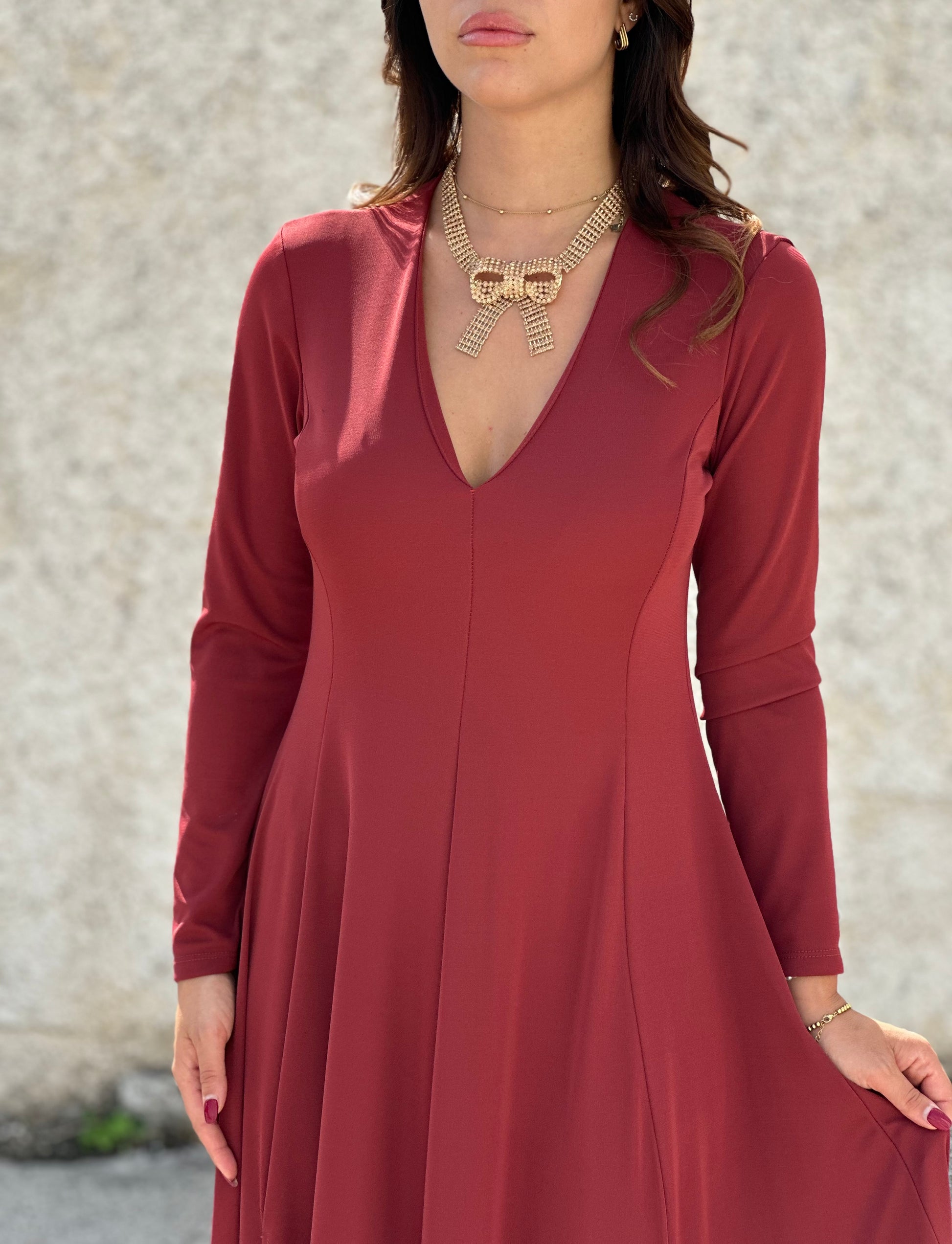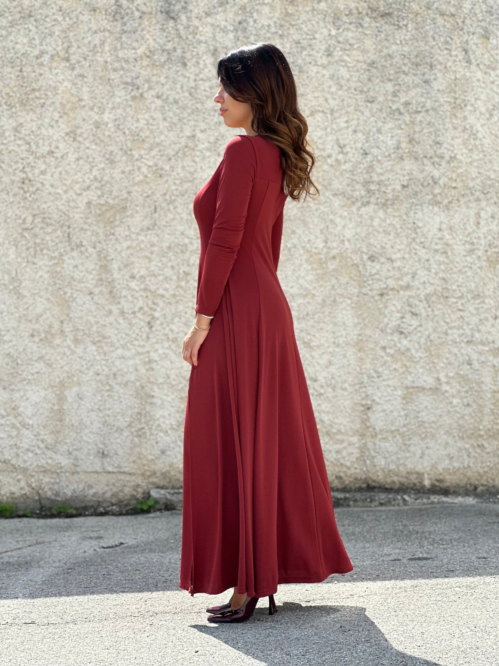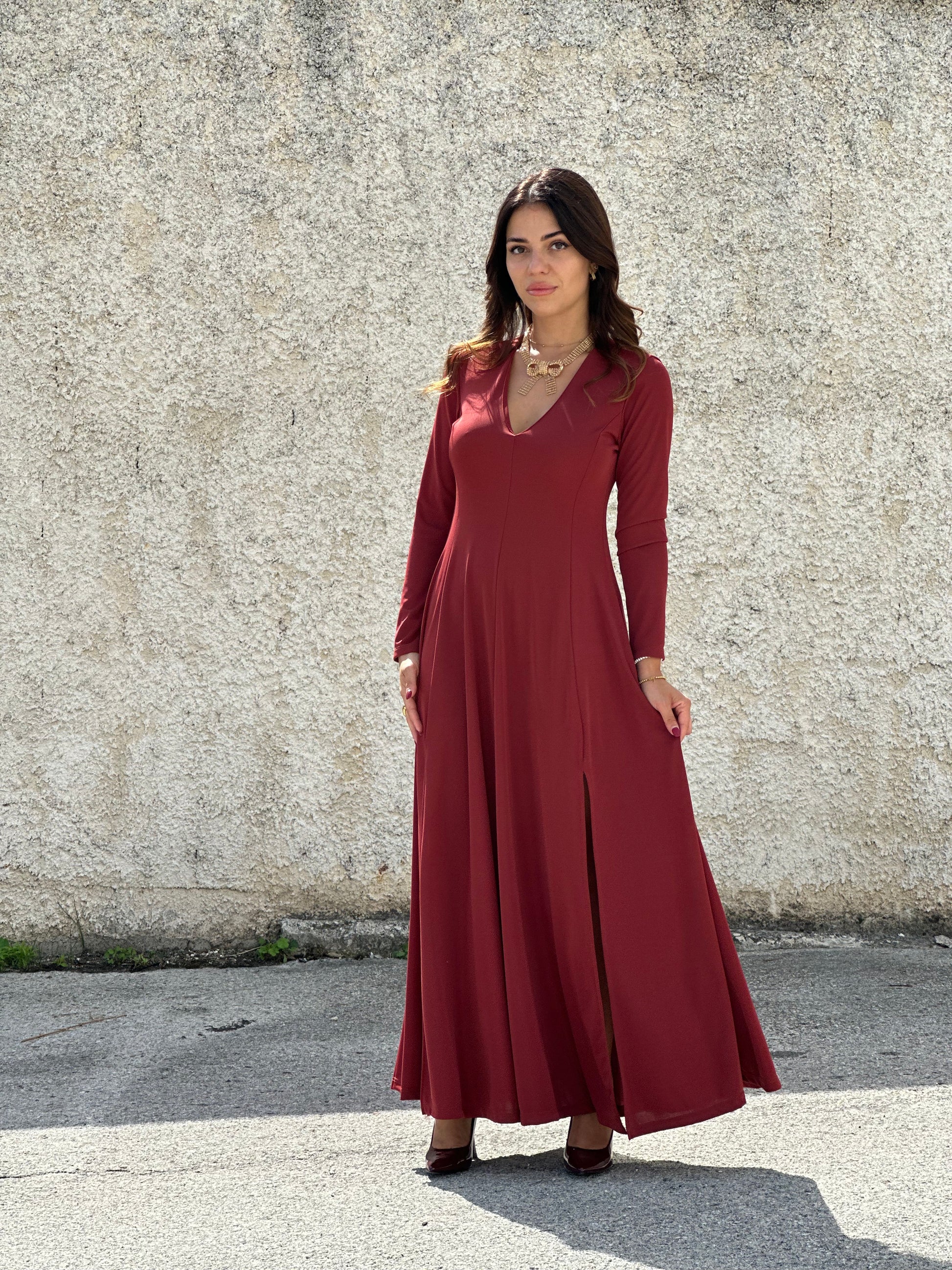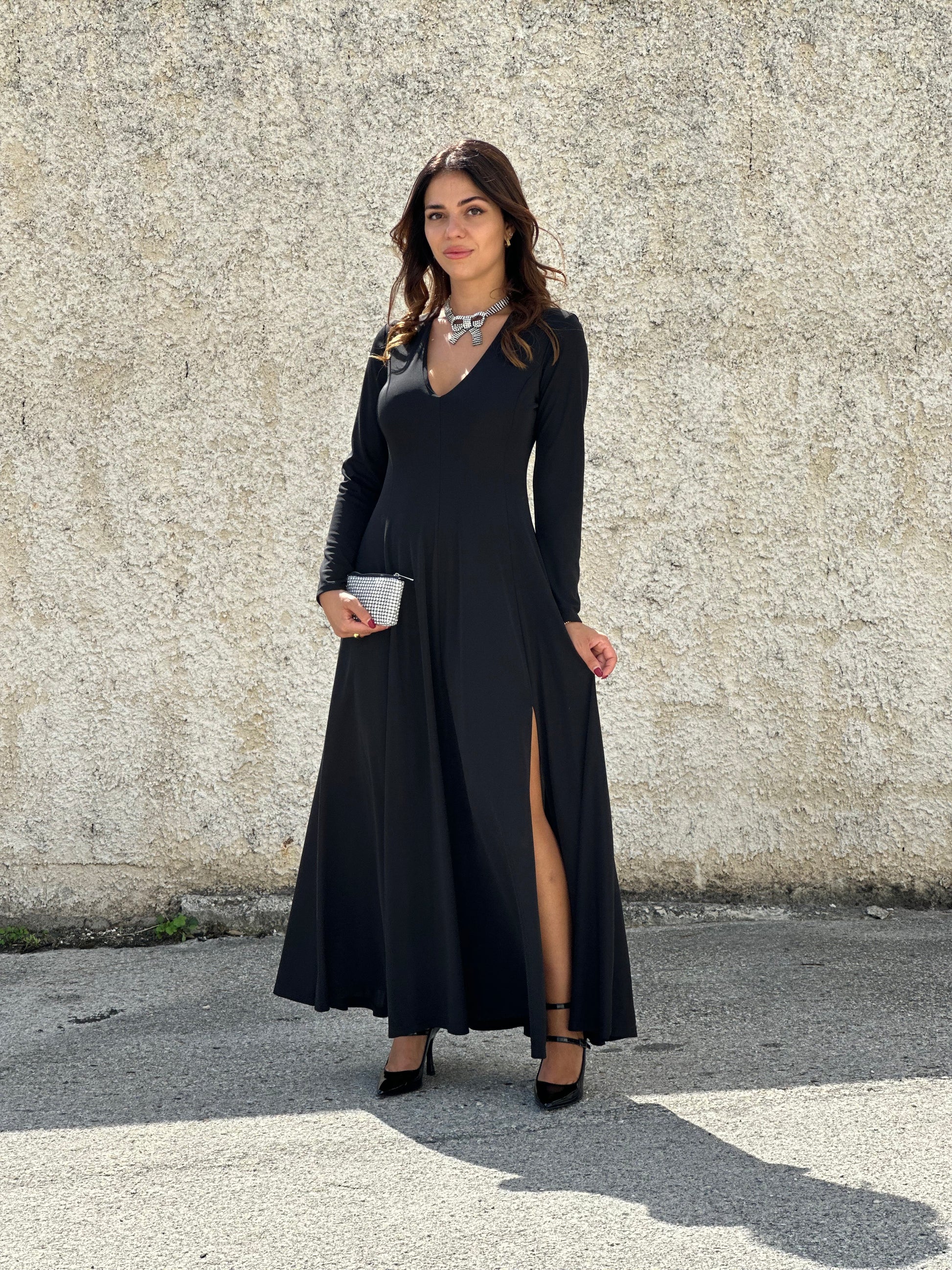 Abito lungo in tessuto elasticizzato con scolo a V e spacchi laterali sul fondo.