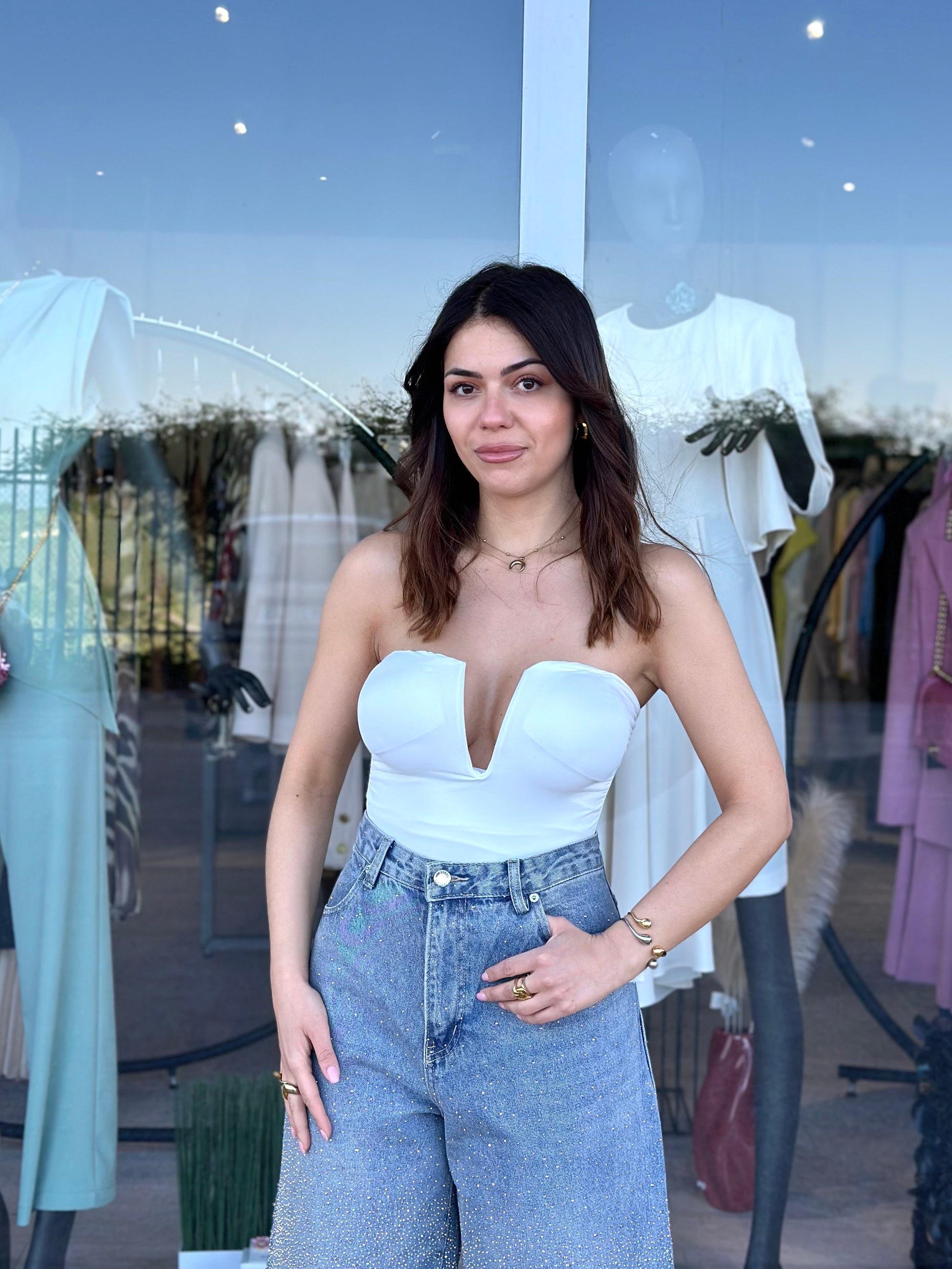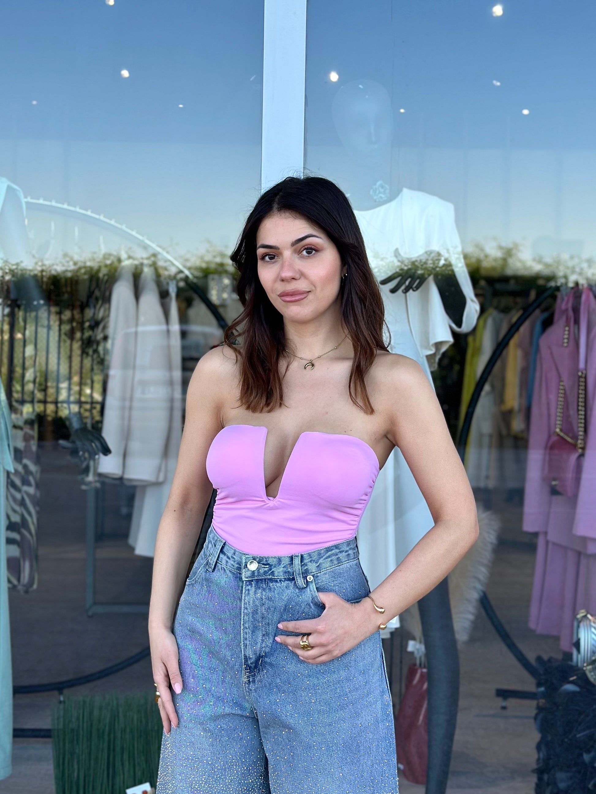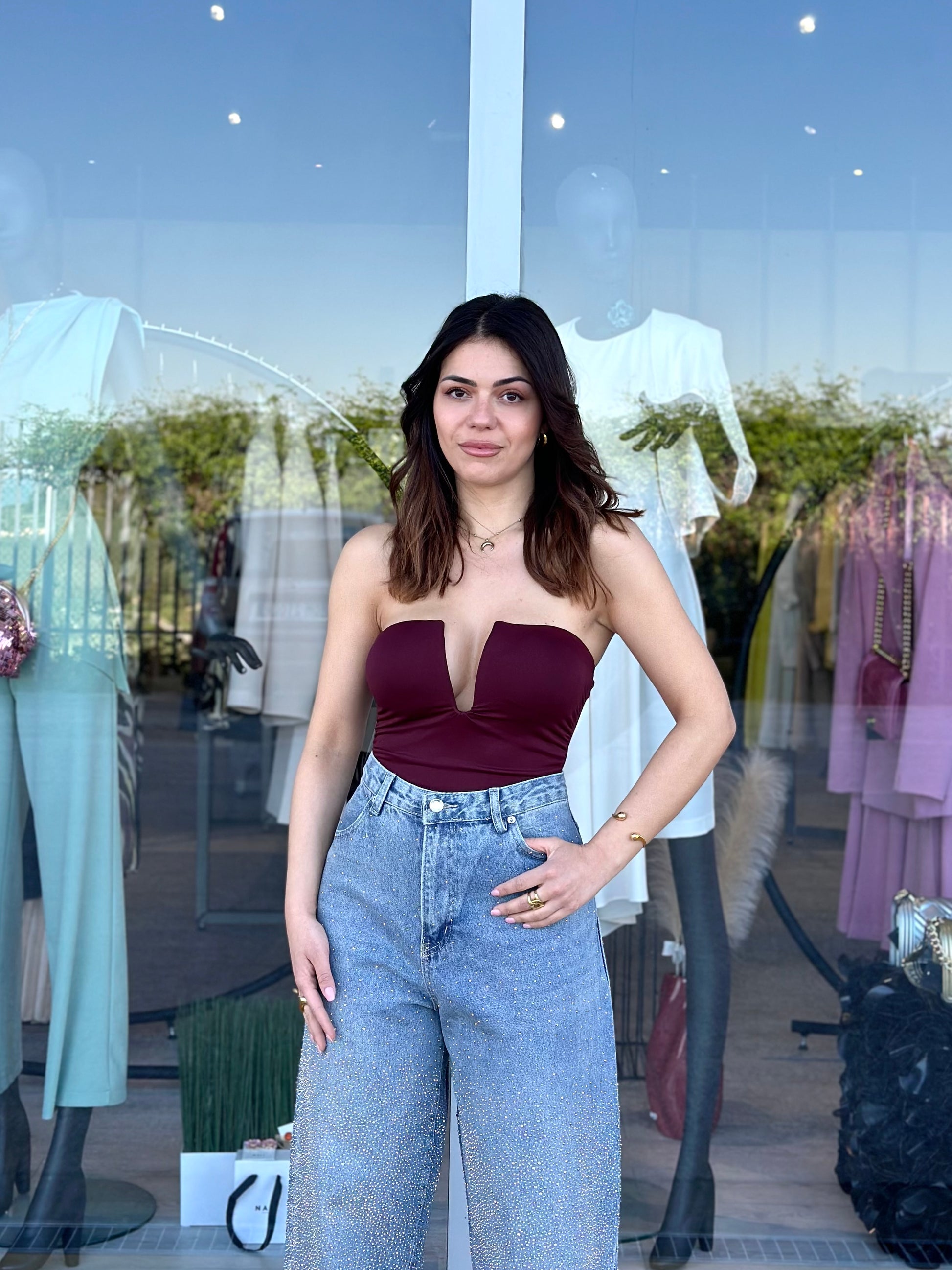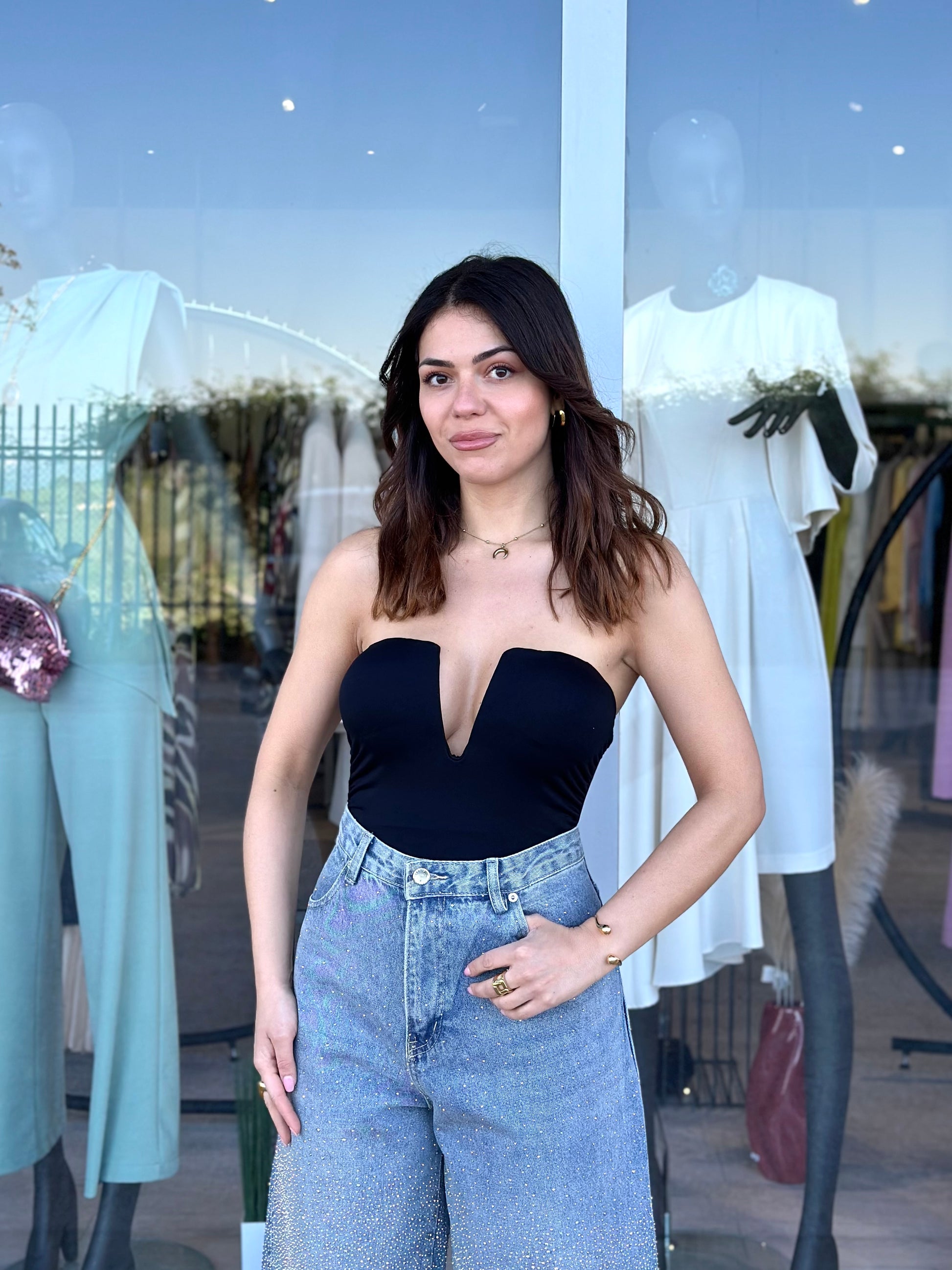 Body con scollo profondo, dettaglio metallico e bretelle regolabili.