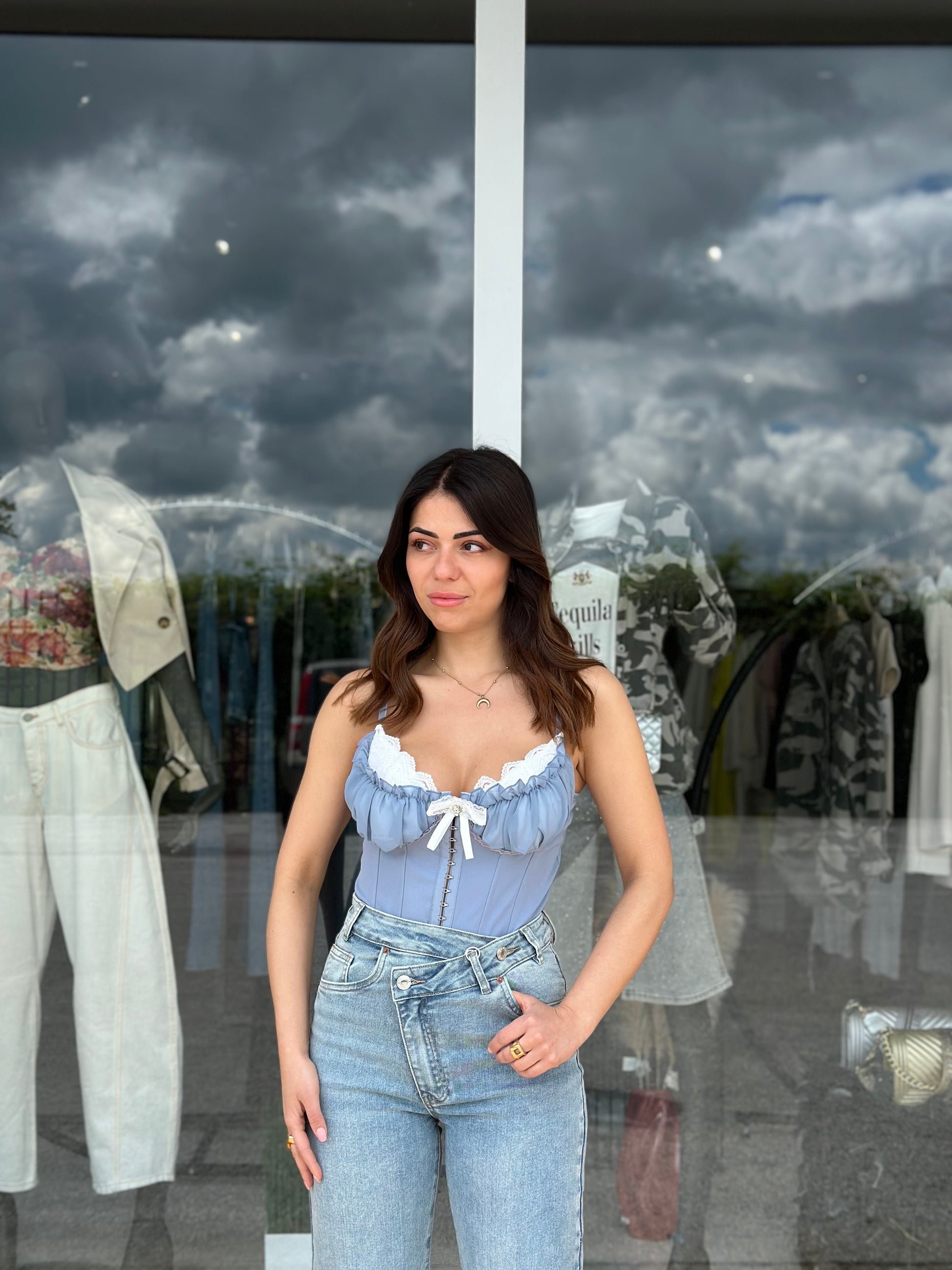 Bustier con inserto in pizzo a contrasto, coppe leggermente imbottite, spilla gioiello rimovibile, bretelle regolabili e apertura con gancetti sul davanti.