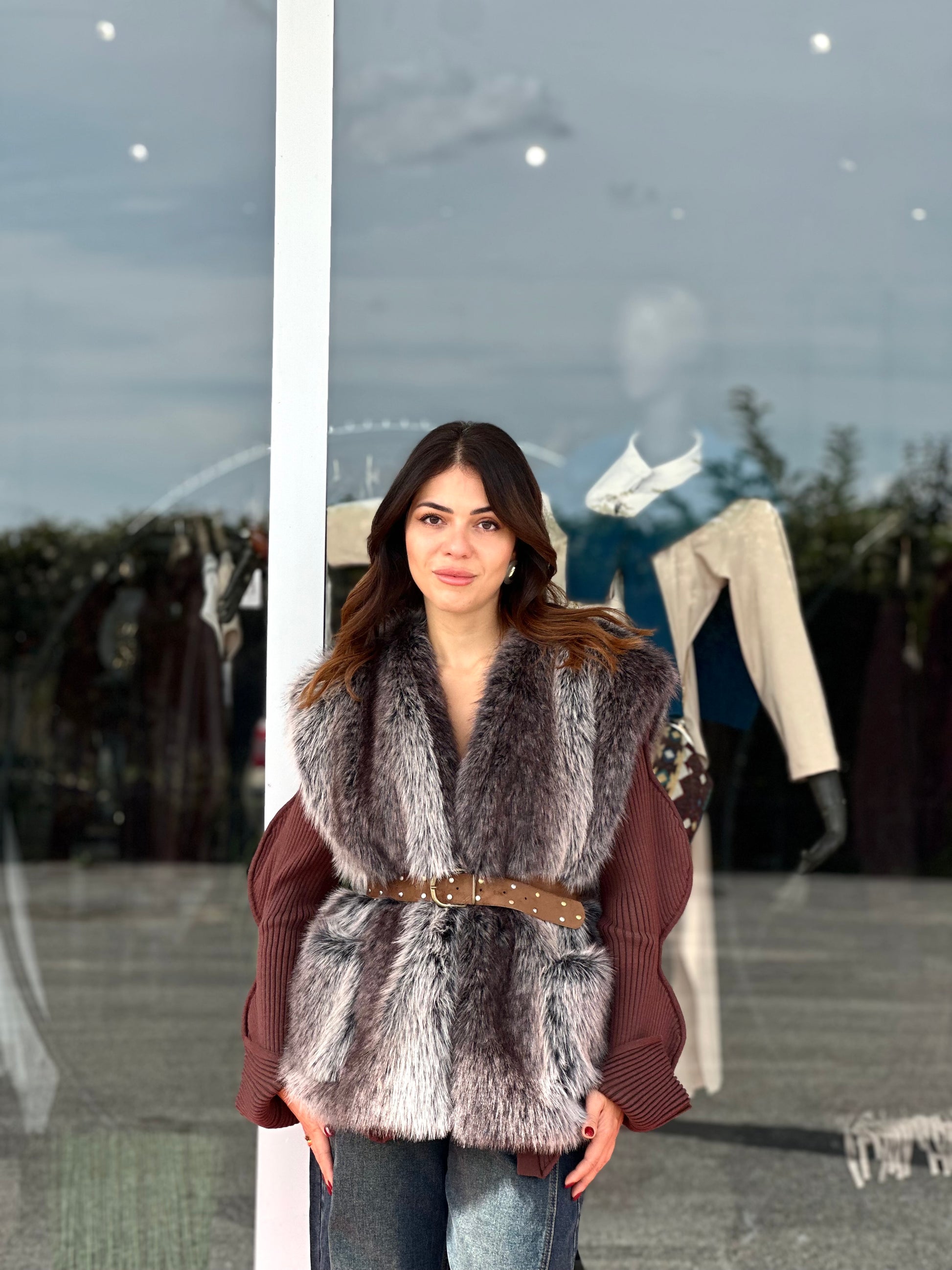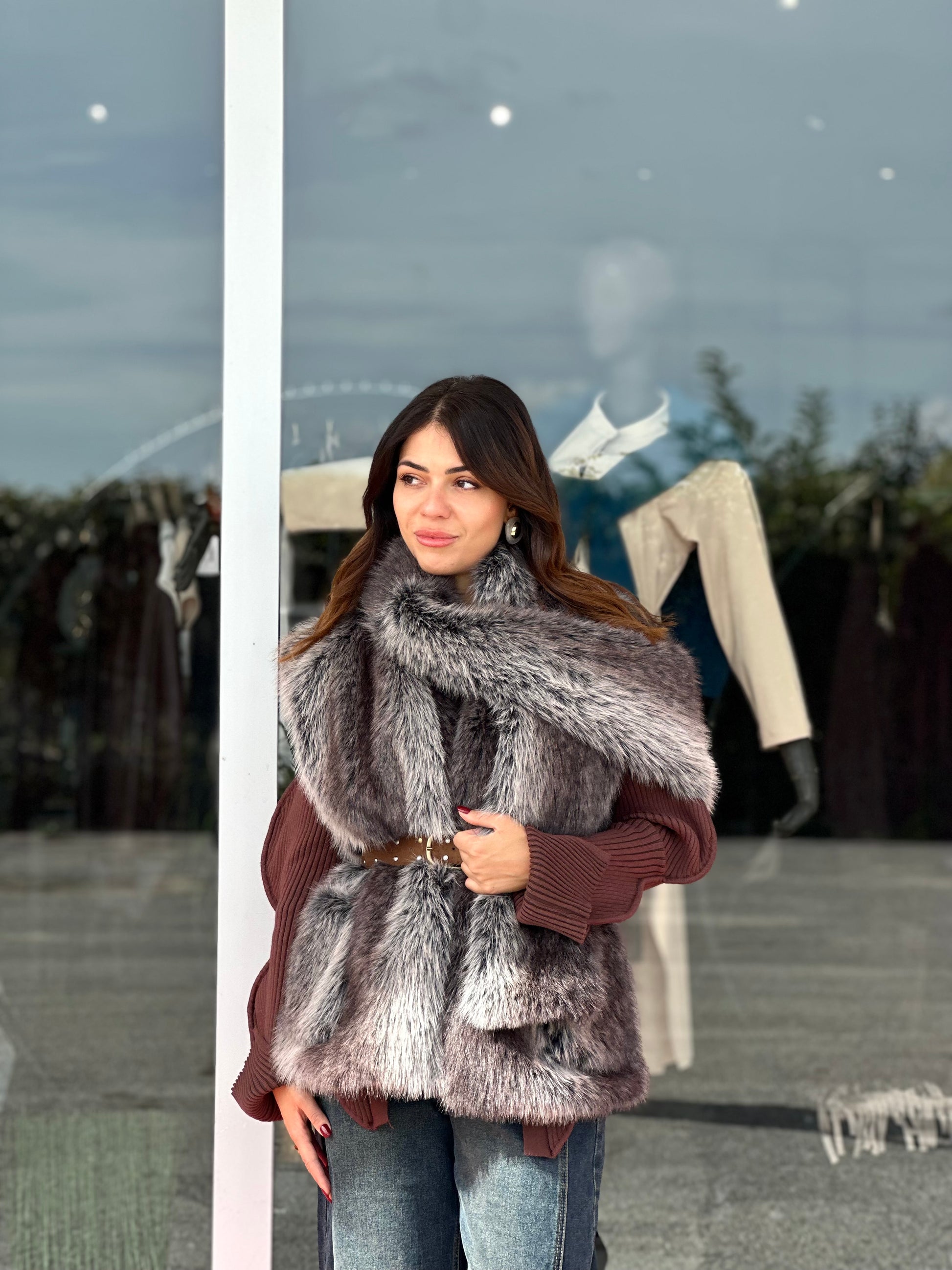 Gilet in ecopelliccia similvera con scialle abbinato e cintura cuoio con borchie.