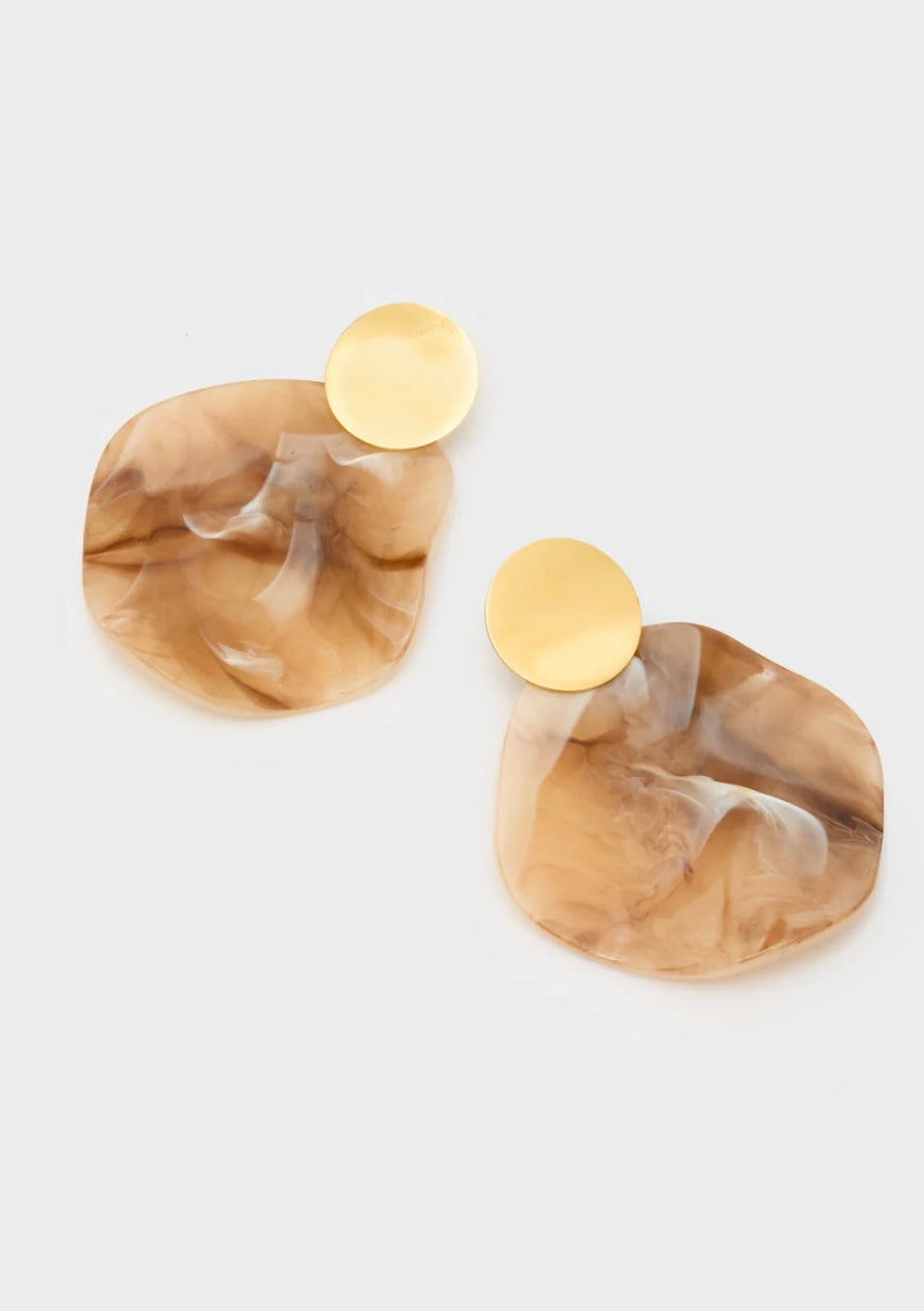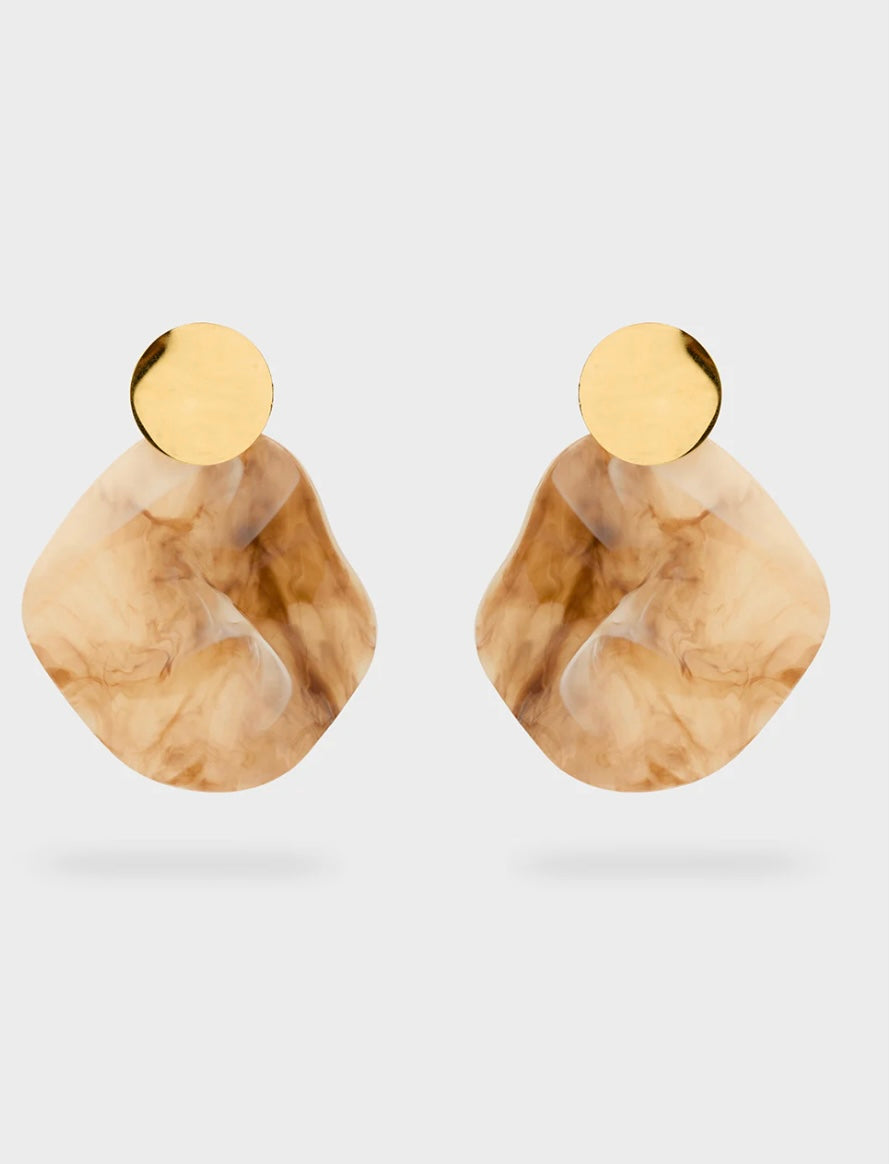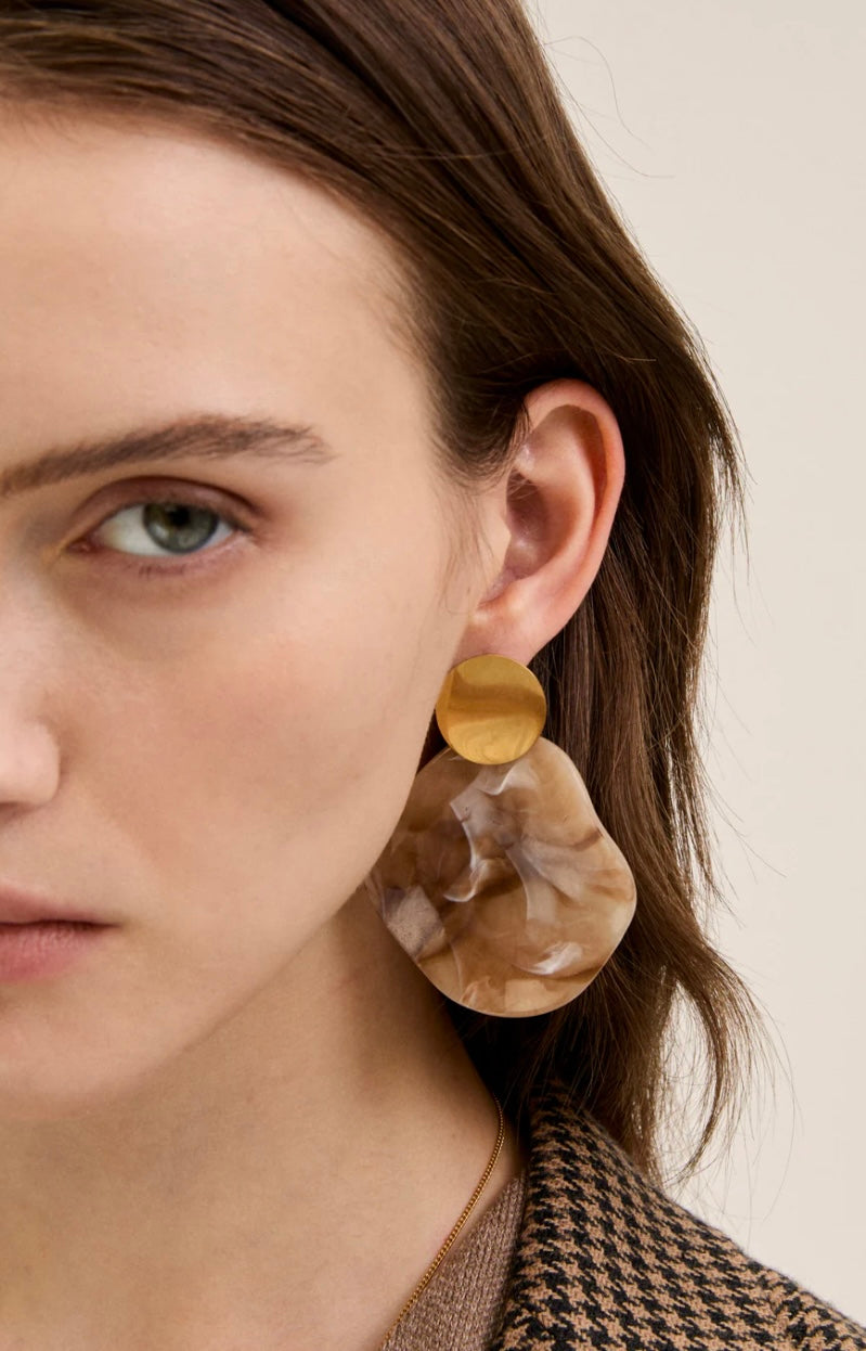 Orecchini pendenti con elemento in resina effetto marmo e bottone dorato, dallo stile unico e sofisticato.