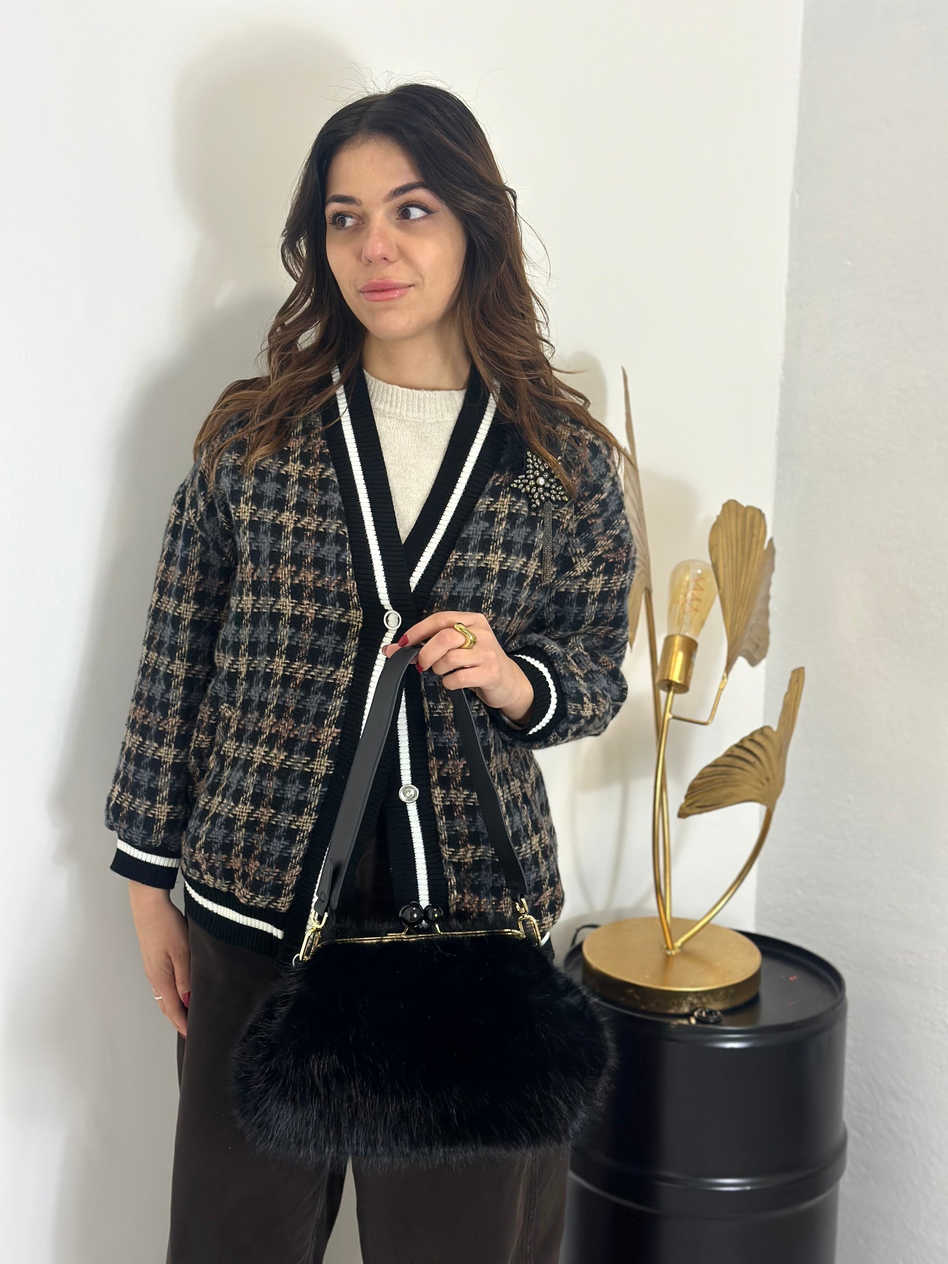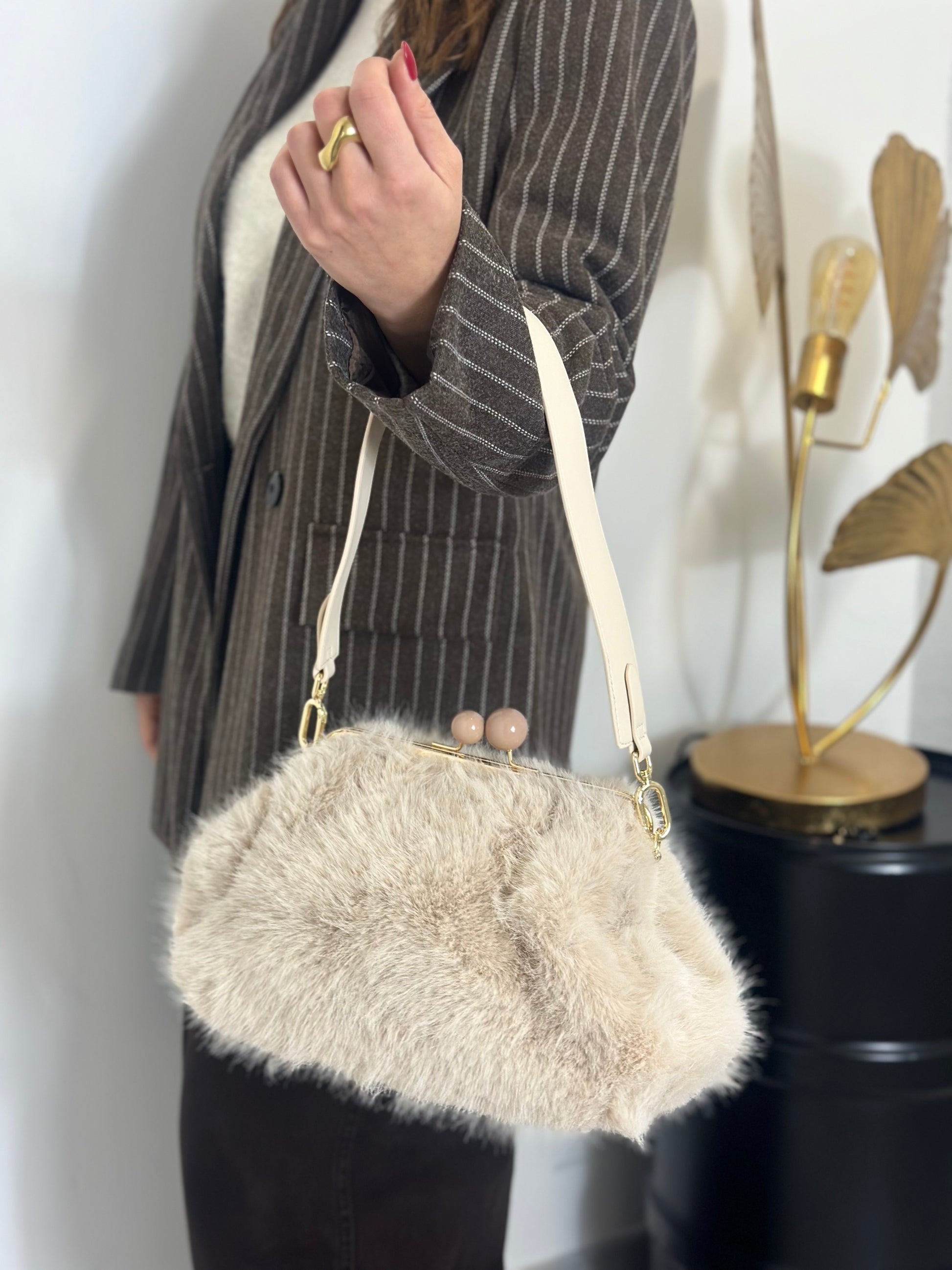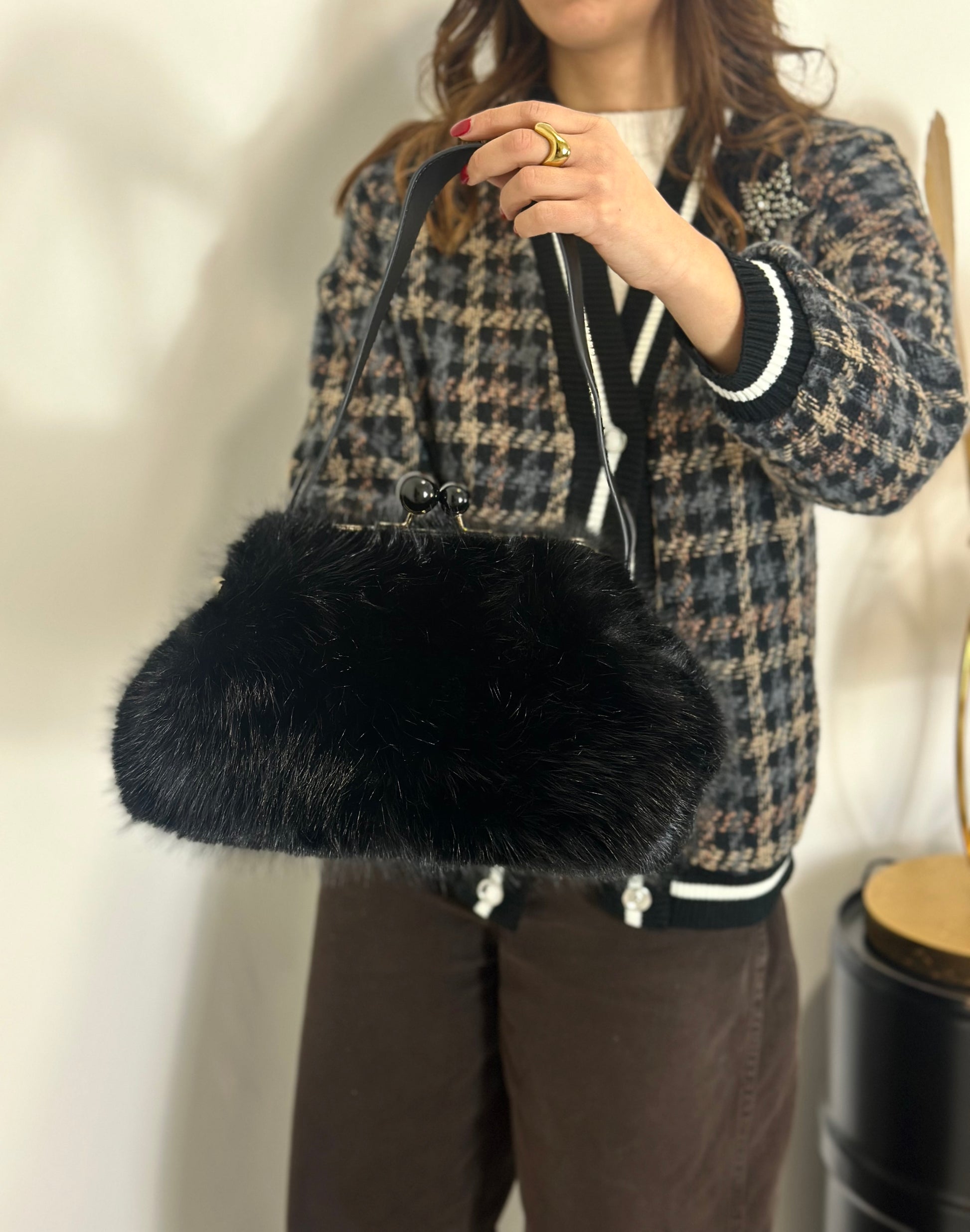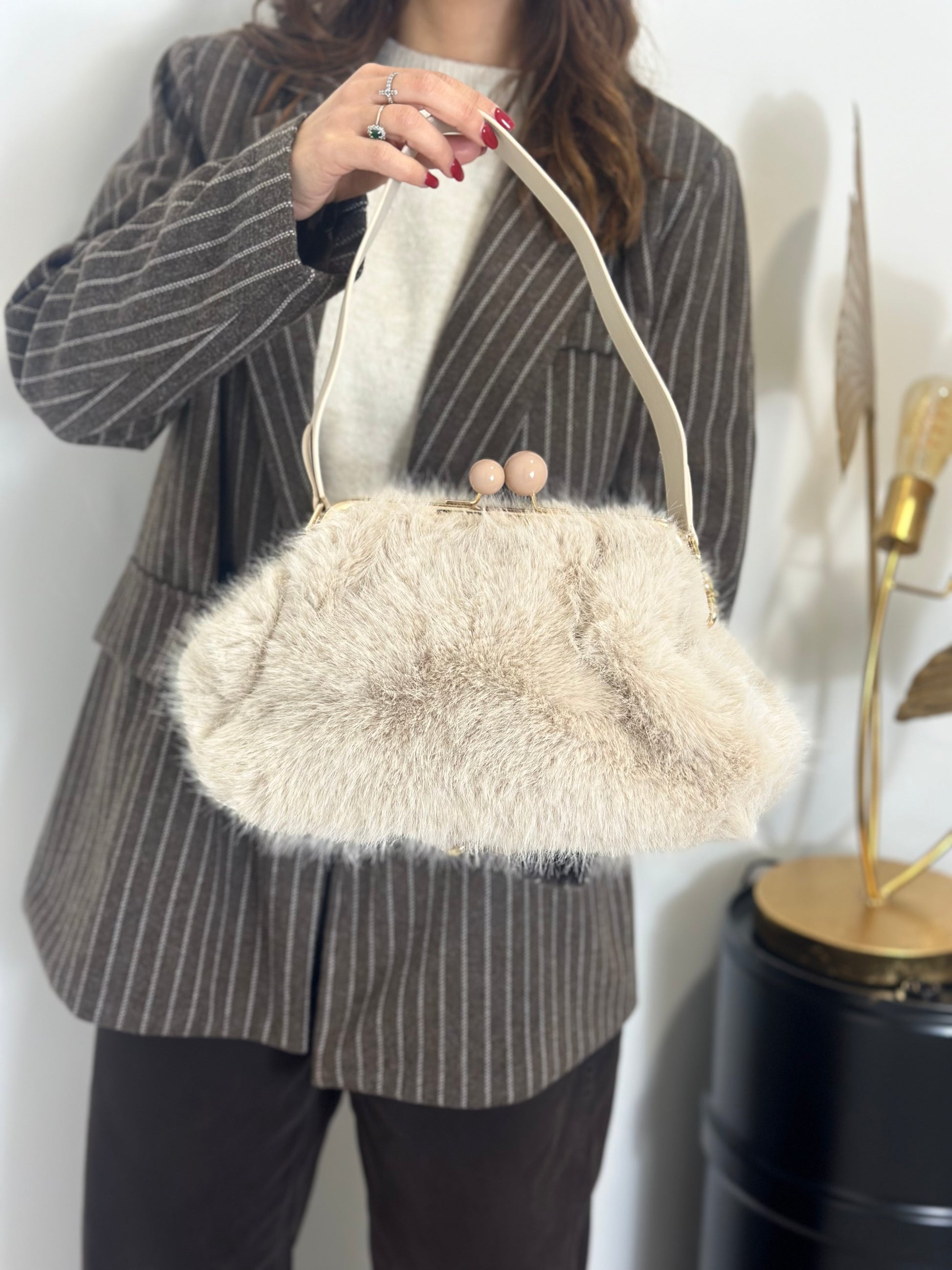 Borsa grandezza media in ecopelliccia con chiusura con gancetti a scatto.