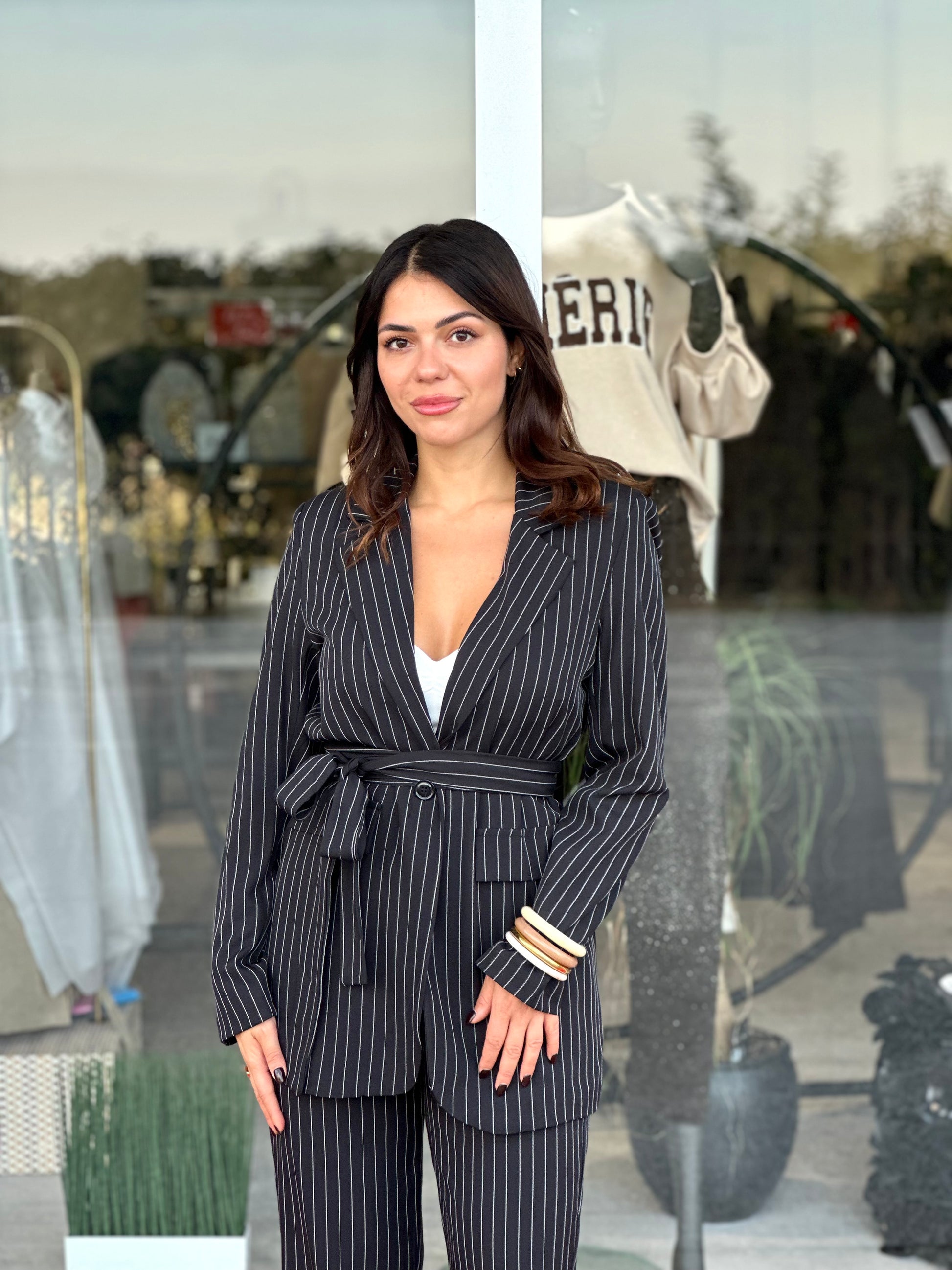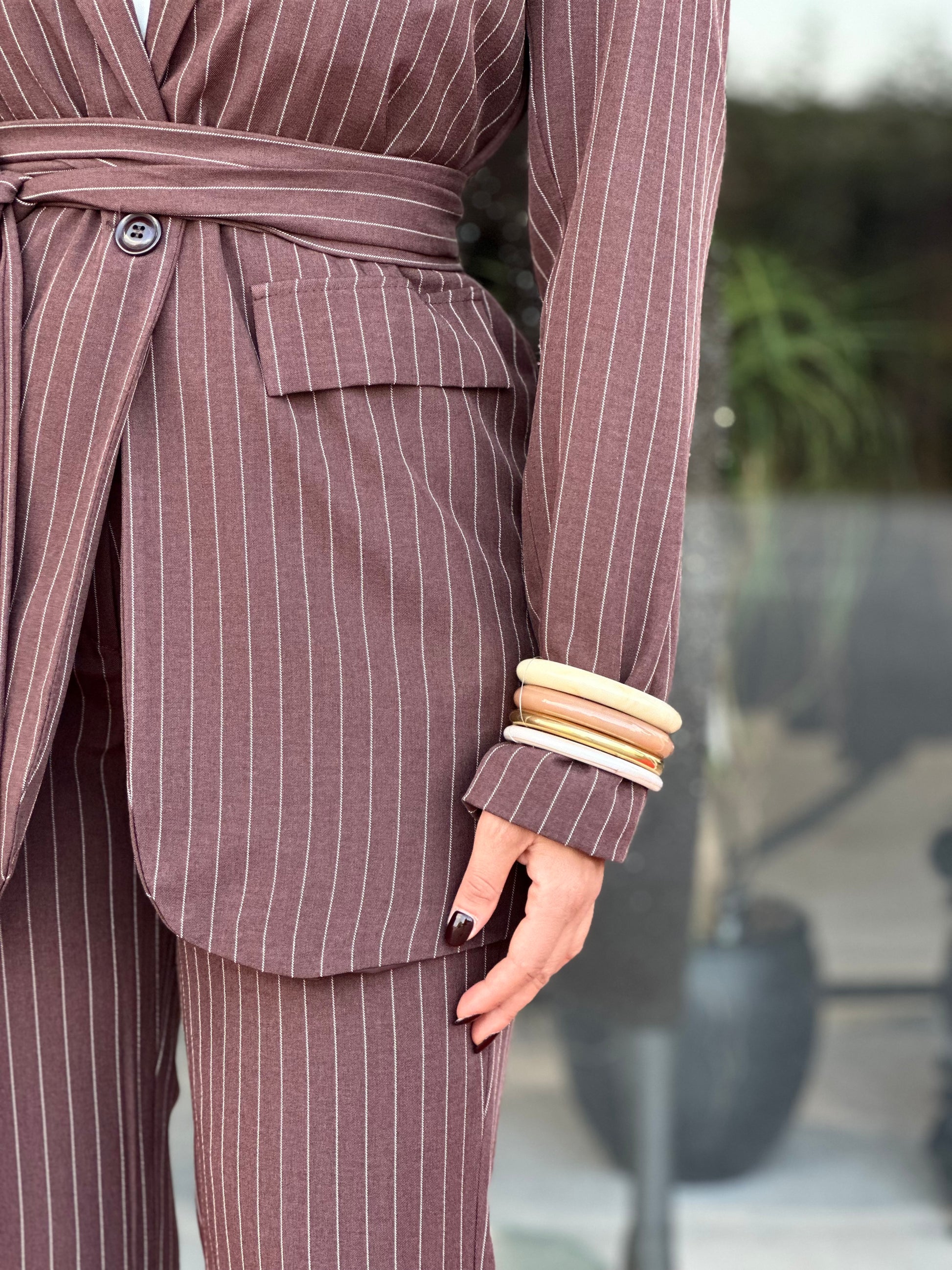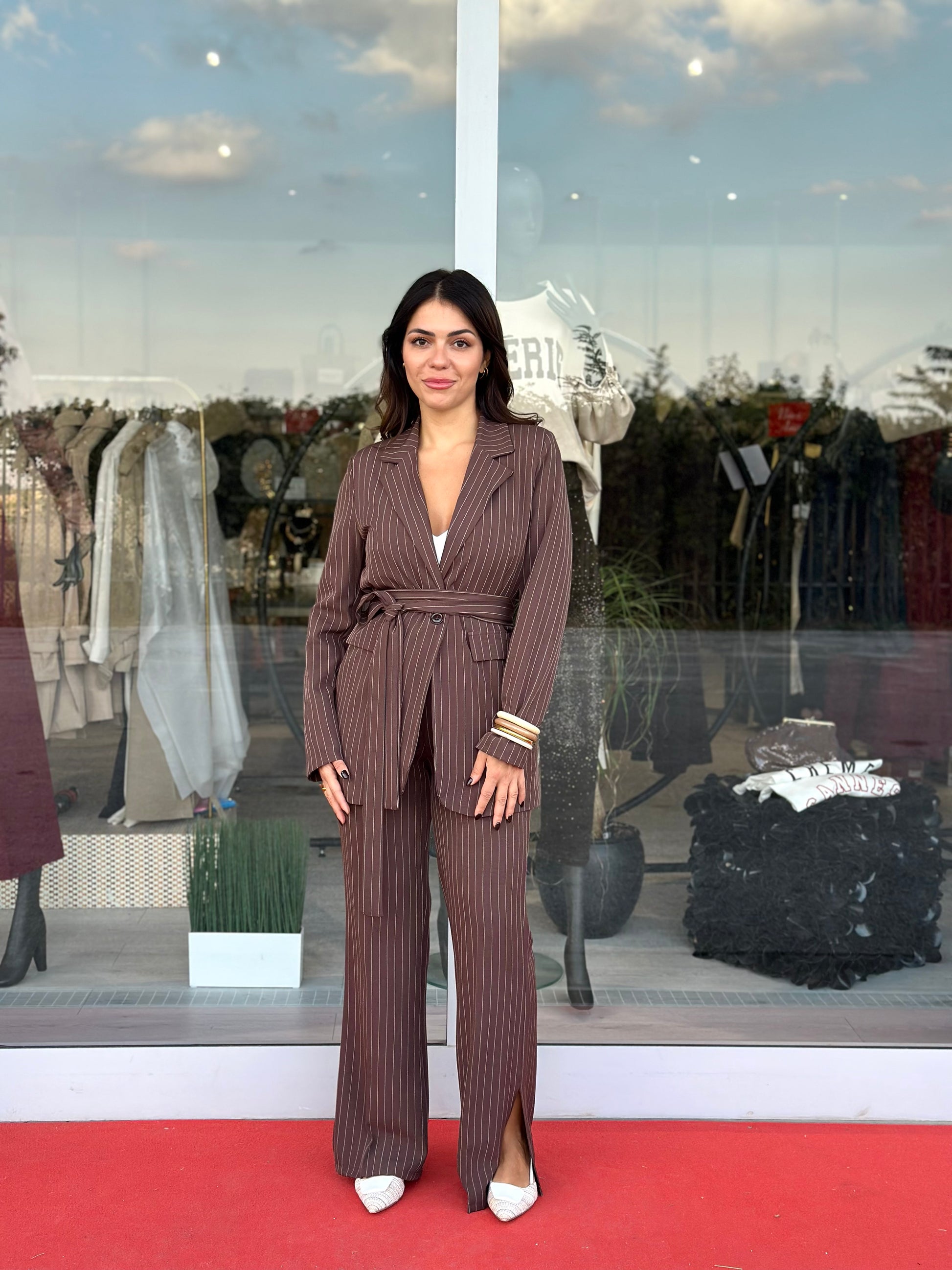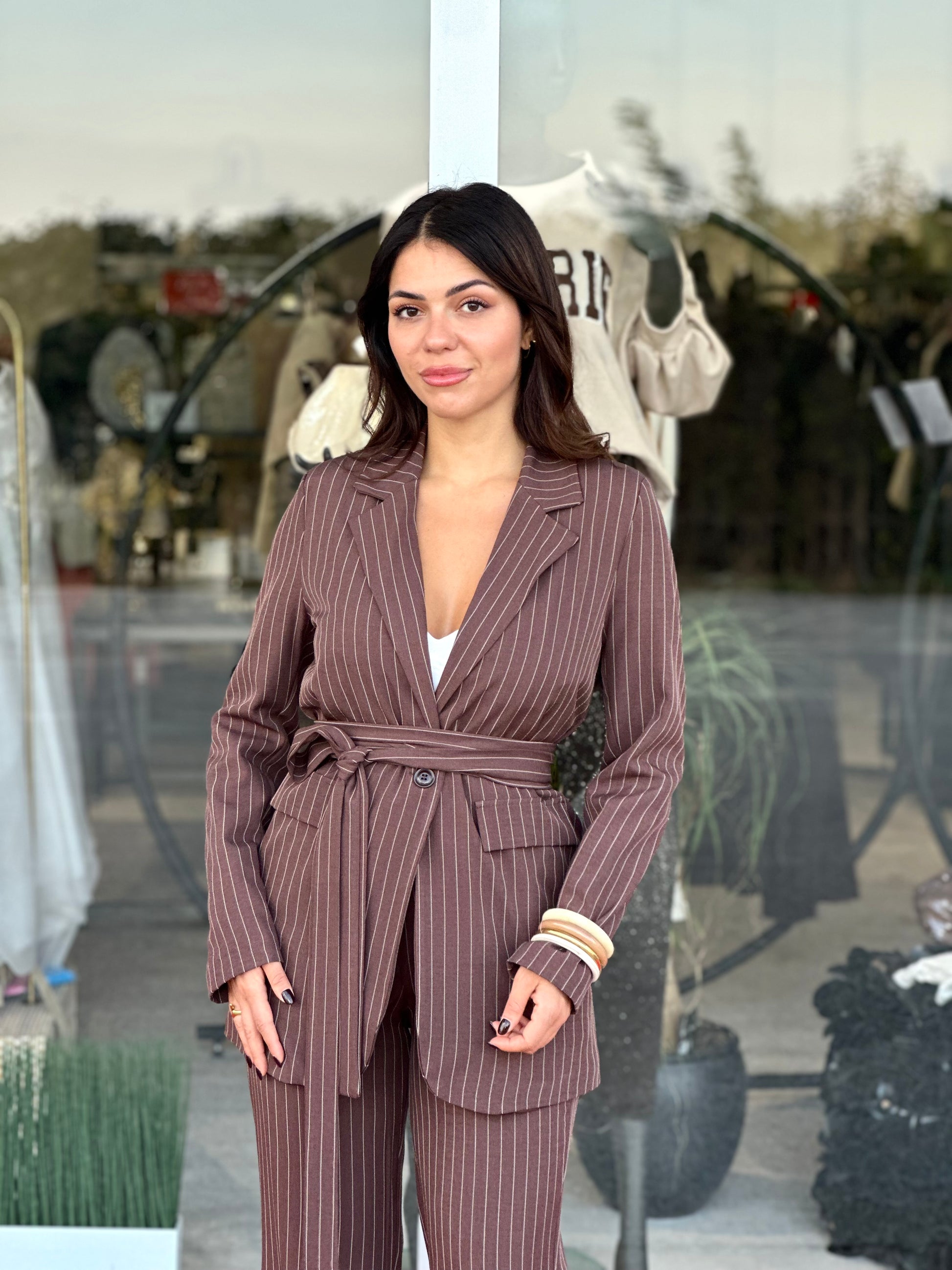 Completo gessato composto da pantaloni a zampa con spacchetti sul fondo e blazer monopetto con cintura.