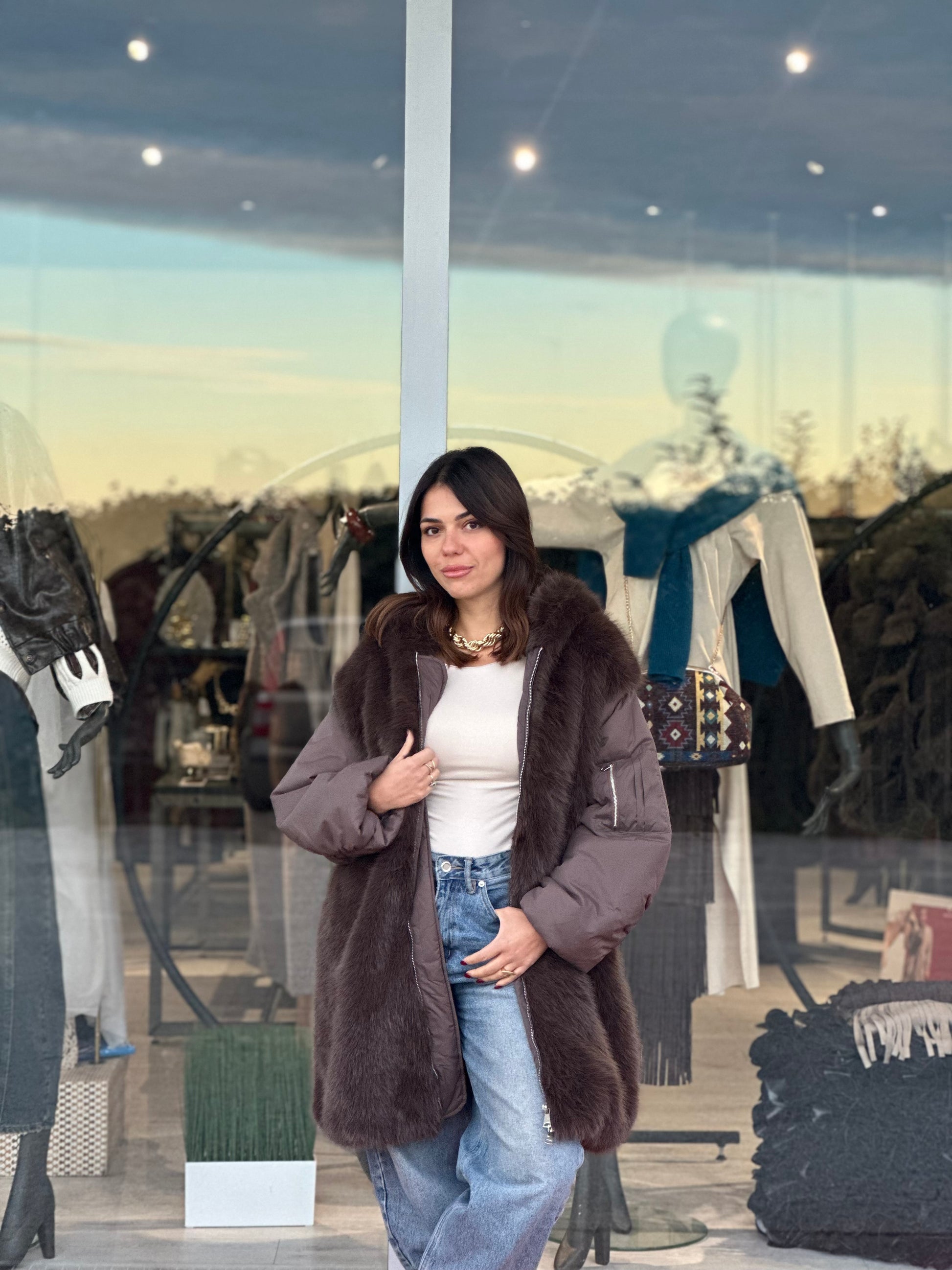 Giacca imbottita con inserti in ecopelliccia e cappuccio.