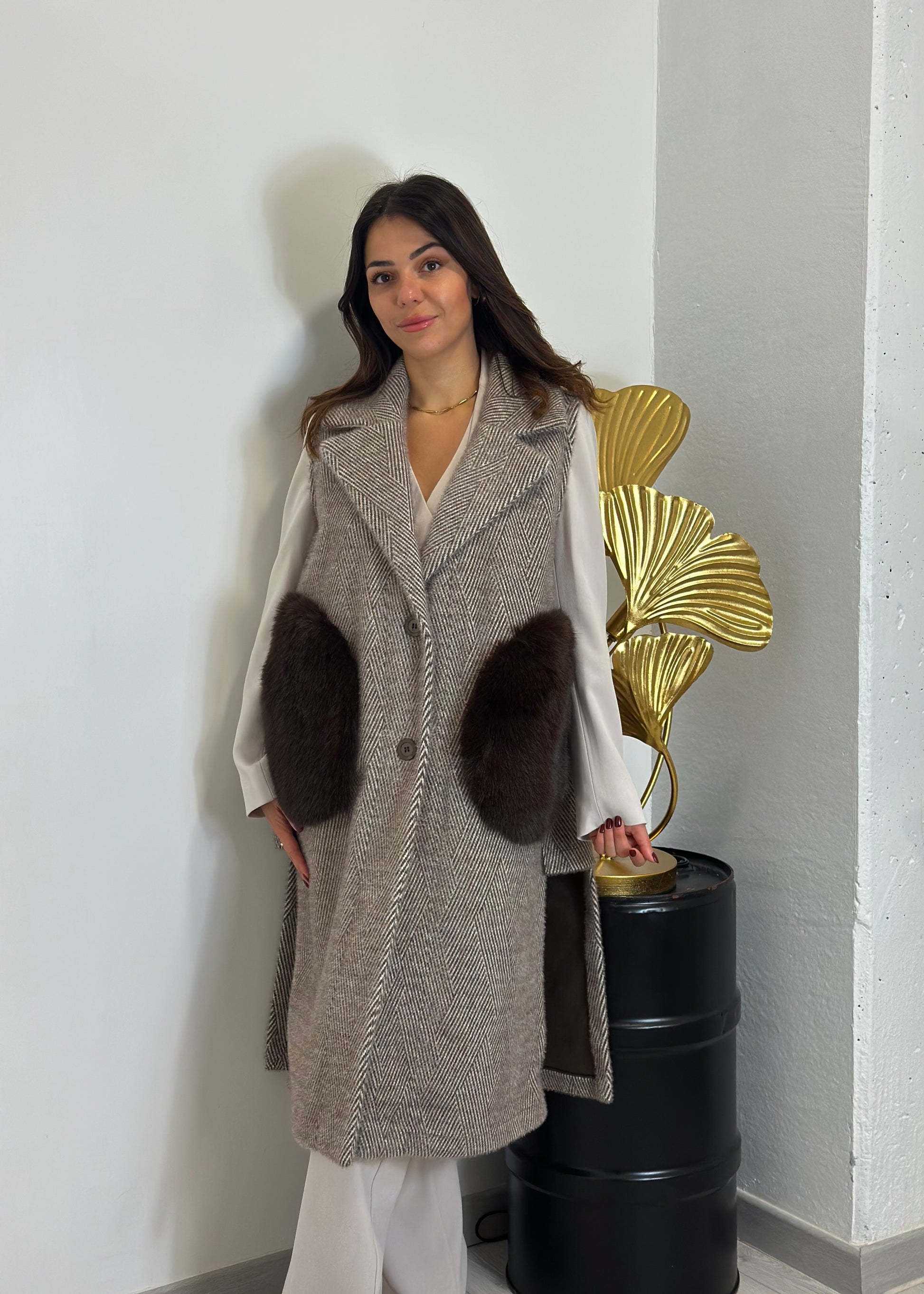 Cappotto smanicato con tasche in ecopelliccia e taglio asimmetrico laterale.