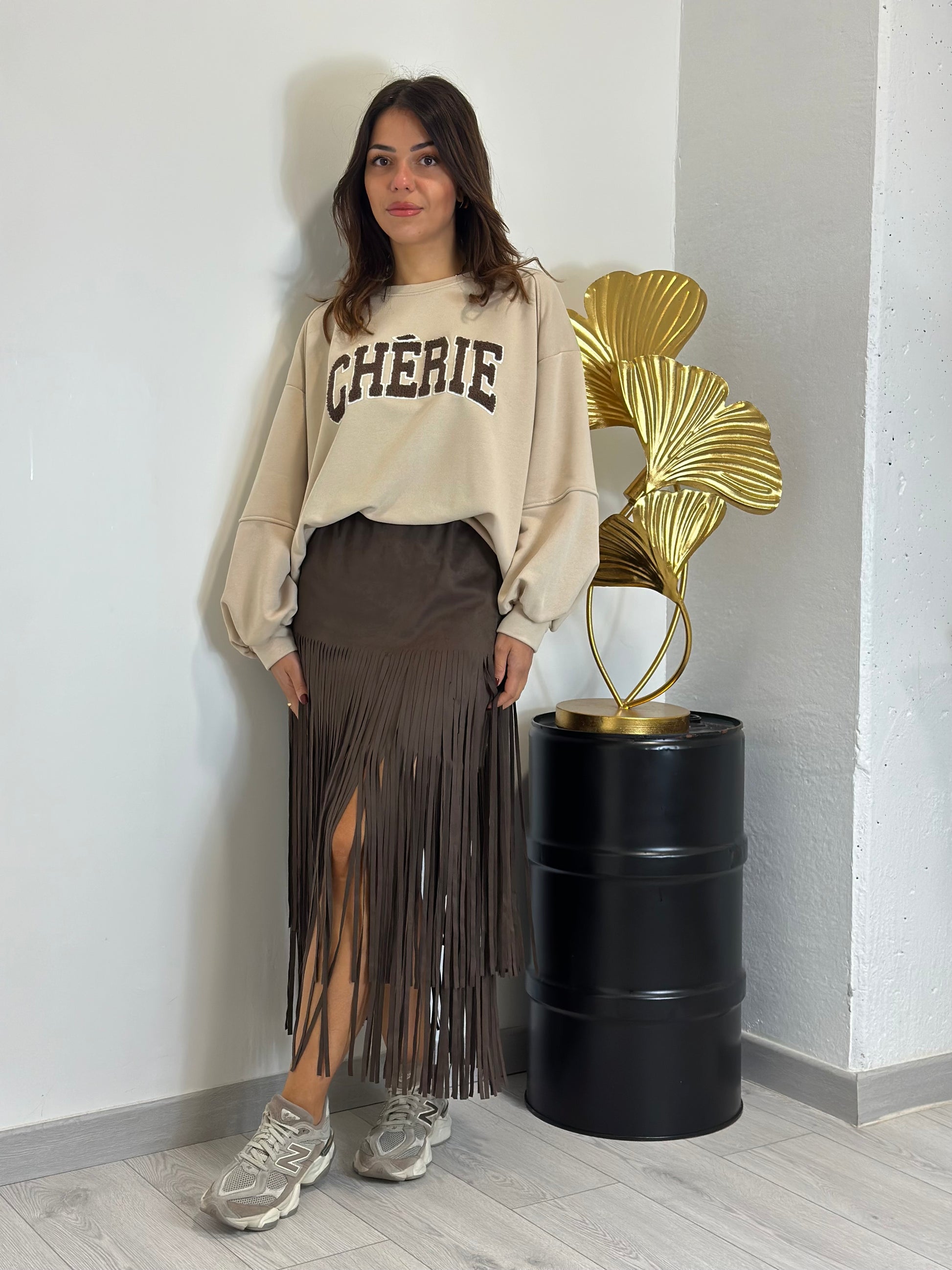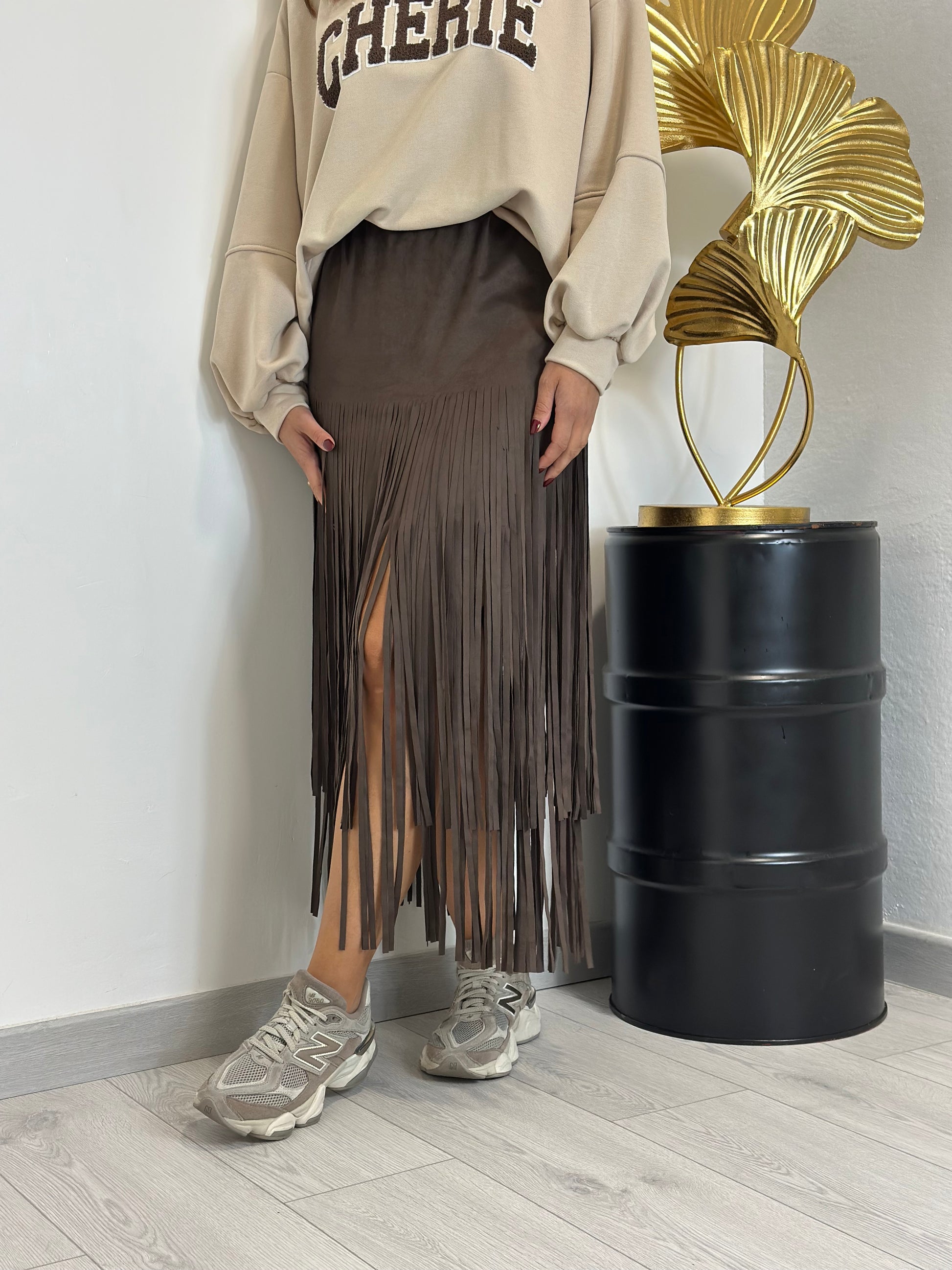 Gonna lunghezza midi in tessuto scamosciato con frange.