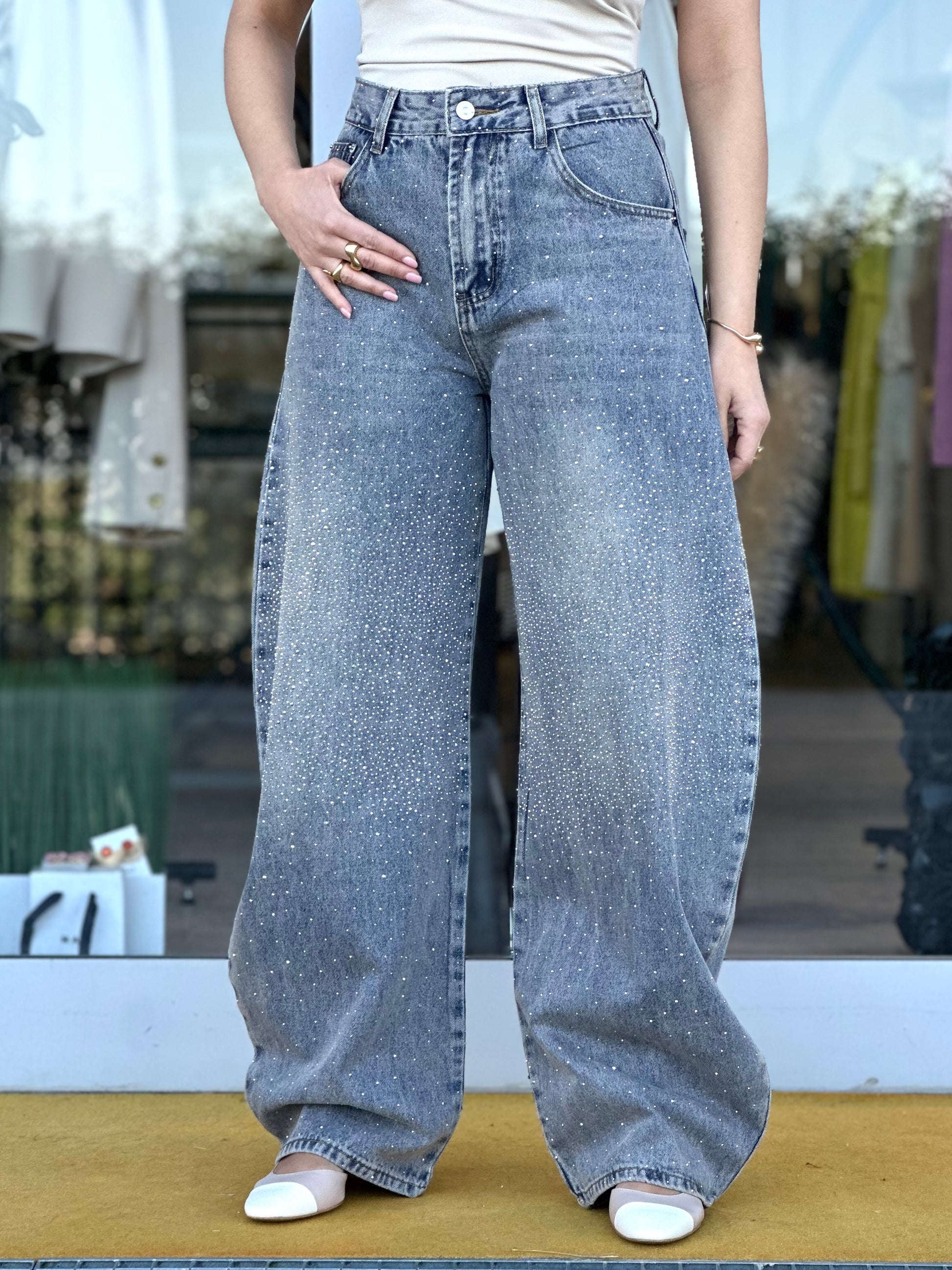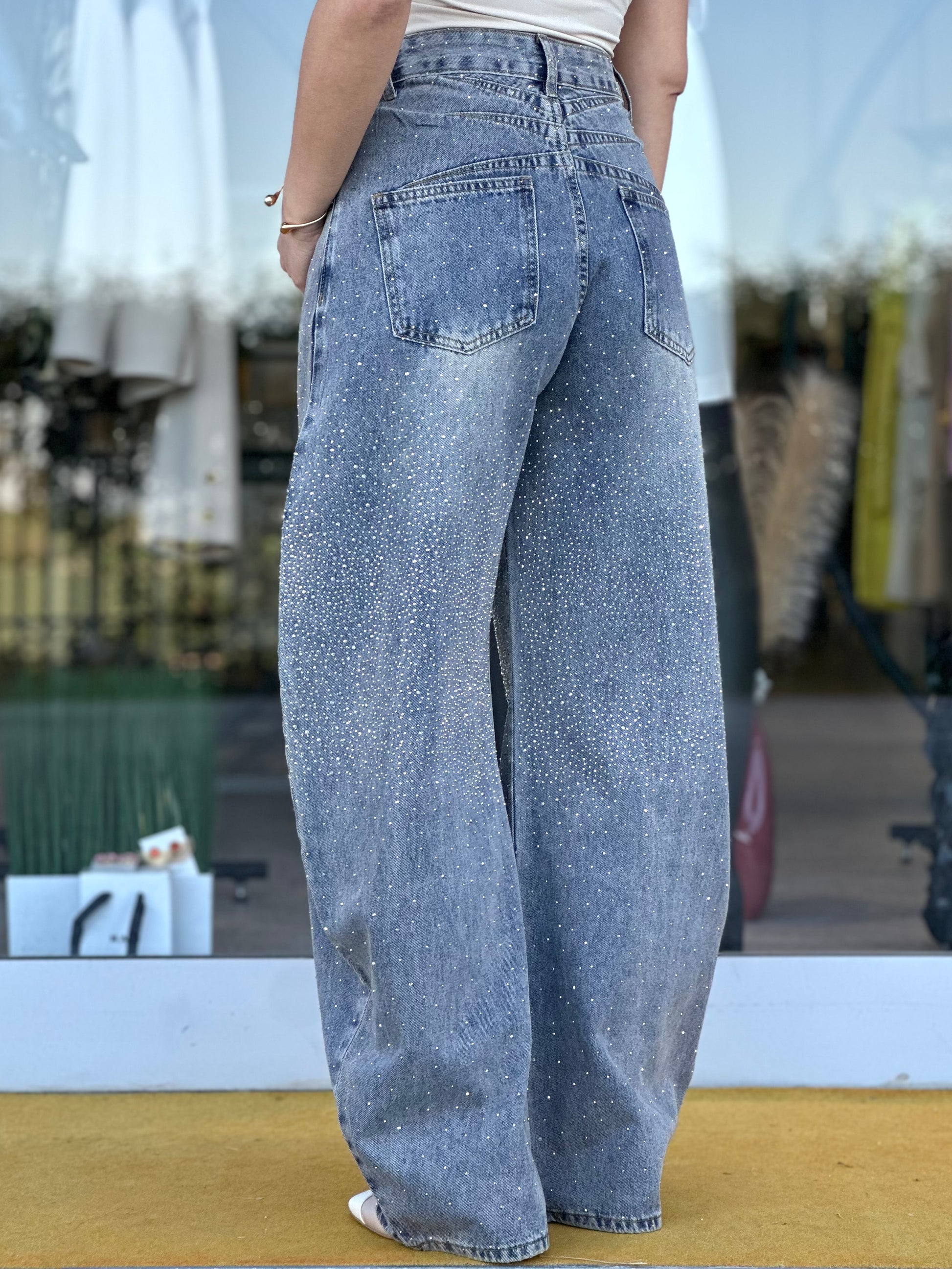 Jeans modello baggy effetto sabbiato impreziositi da strass sia sul davanti che sul retro.