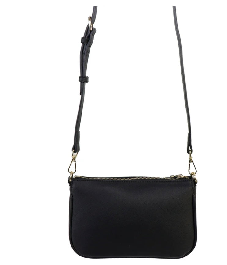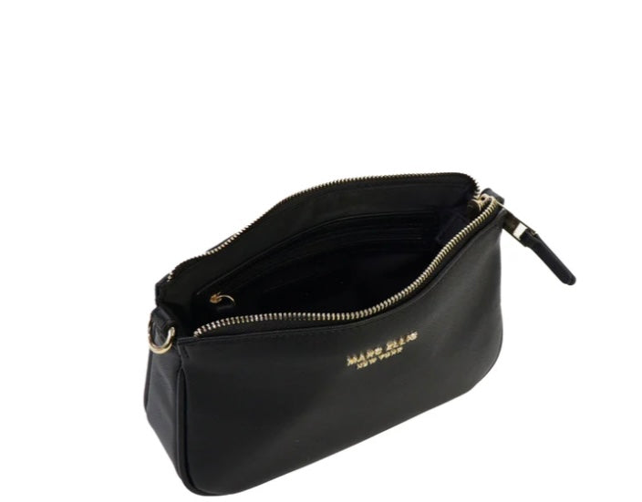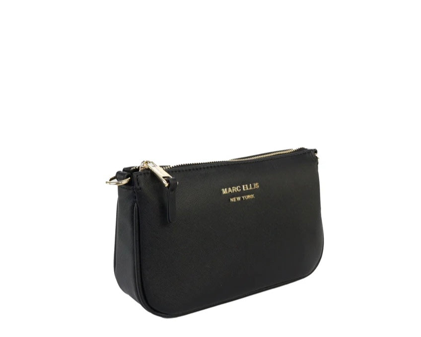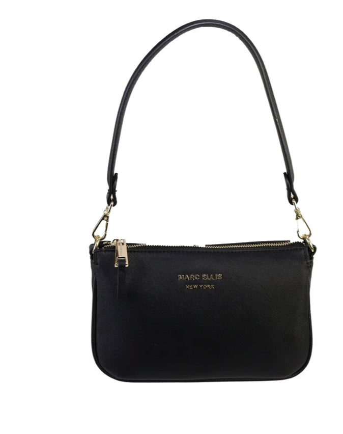 Borsetta a spalla LILLY nera di MARC ELLIS realizzata in ecopelle effetto saffiano con logo in metallo oro. Misure 23x15x6