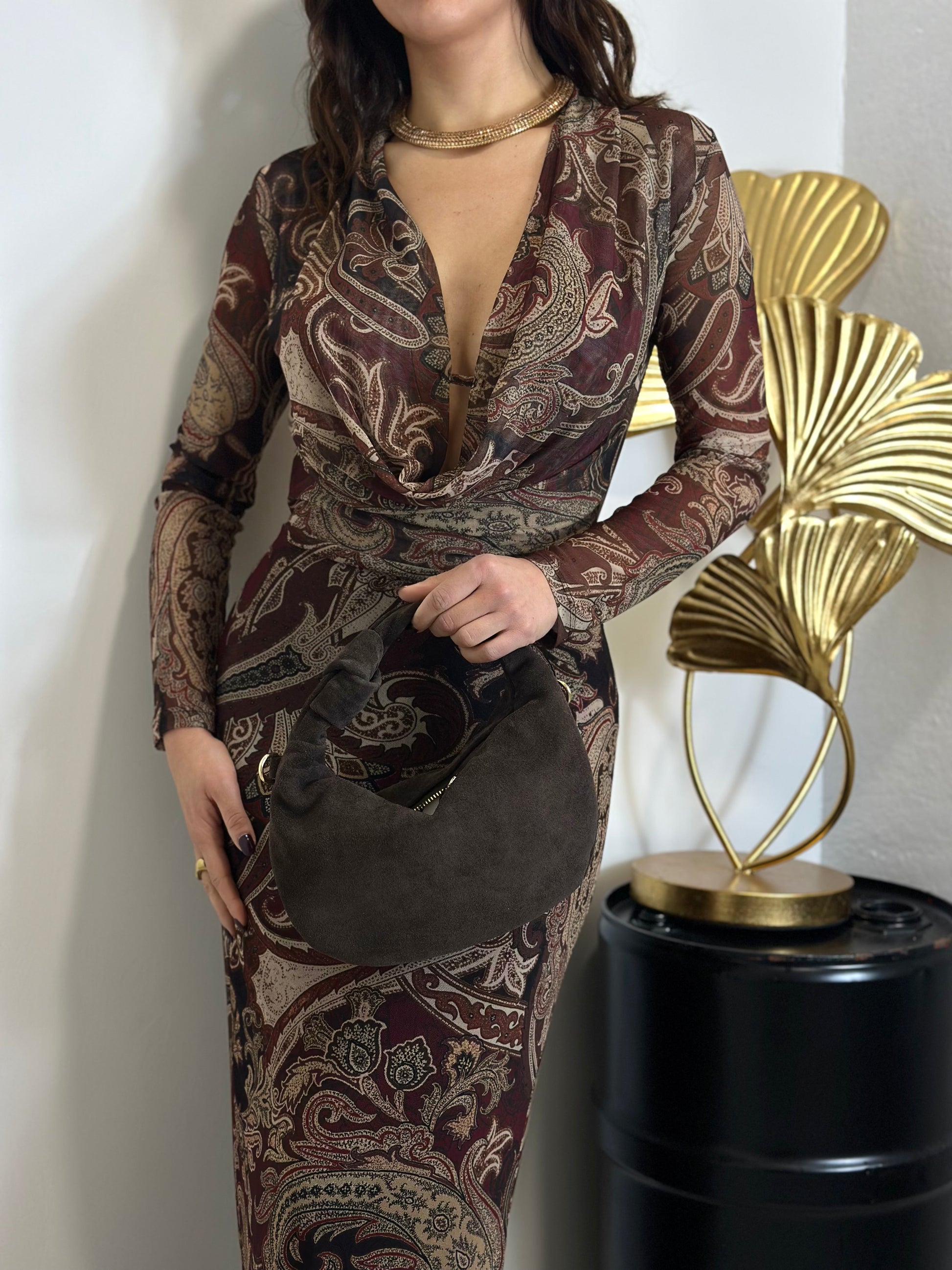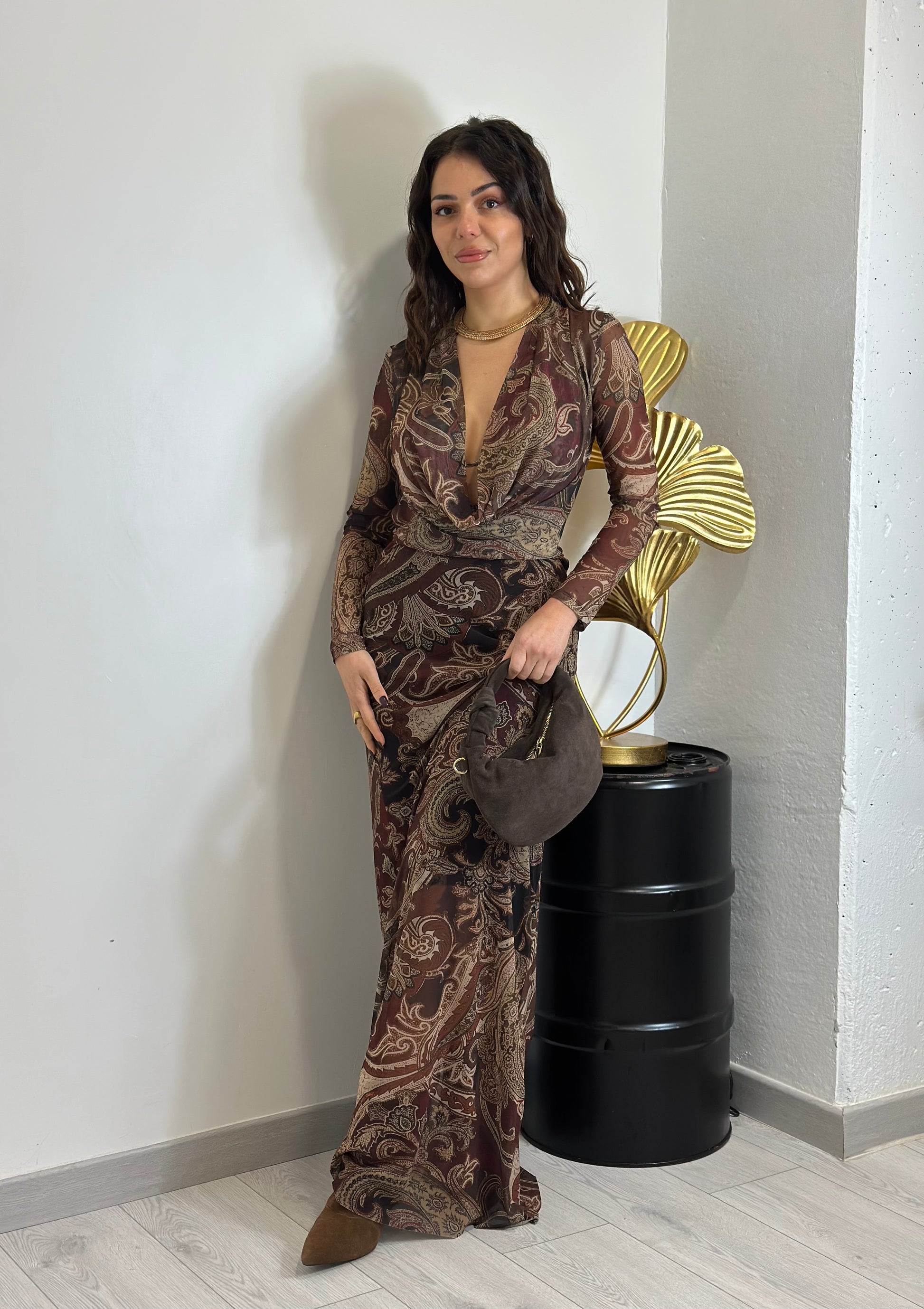 Abito lungo in tulle a fantasia con drappeggio sul davanti con dettaglio cut out e ampio scollo sul retro.
