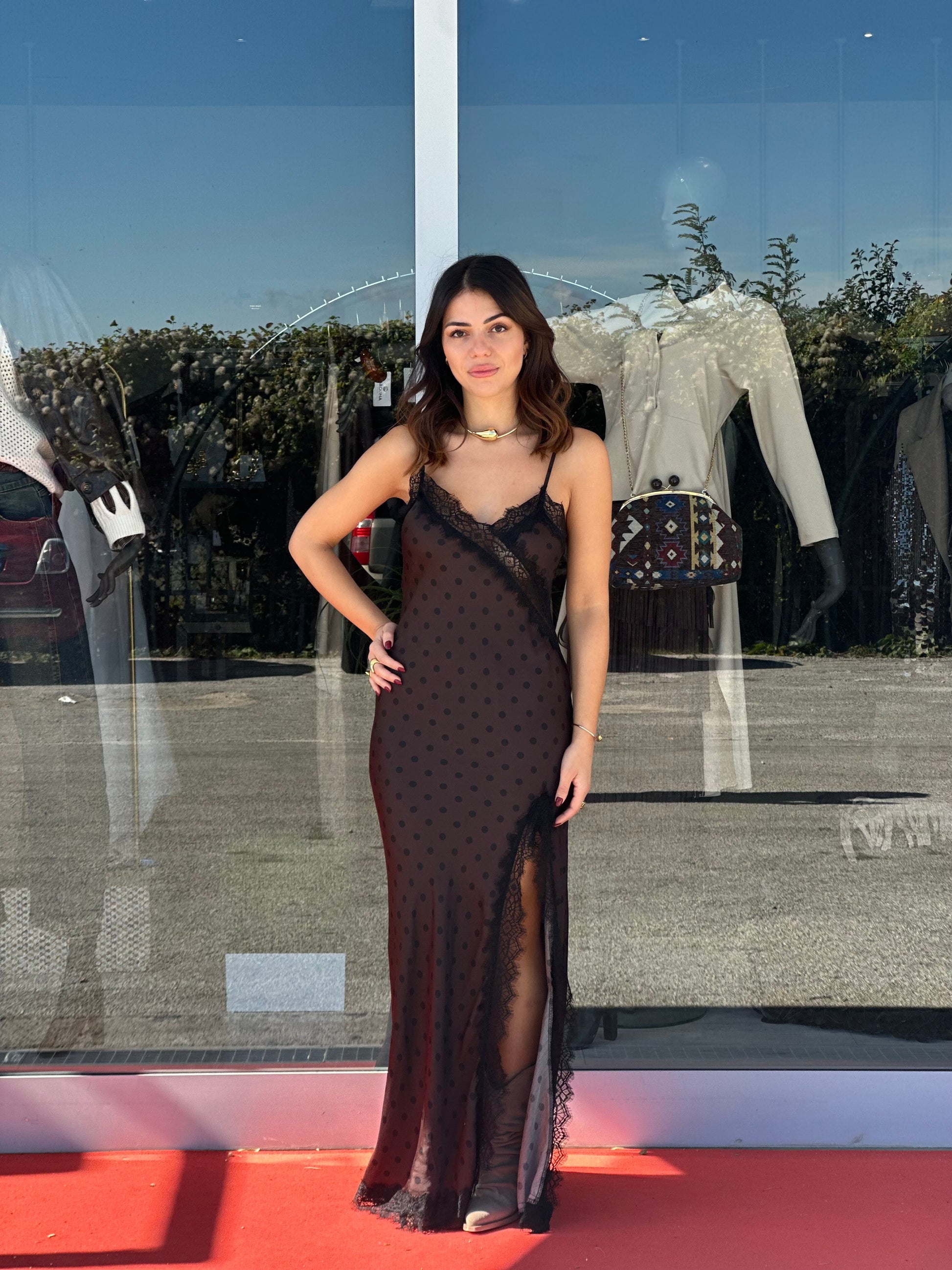 Abito lungo a fantasia con pizzo e spacco laterale.