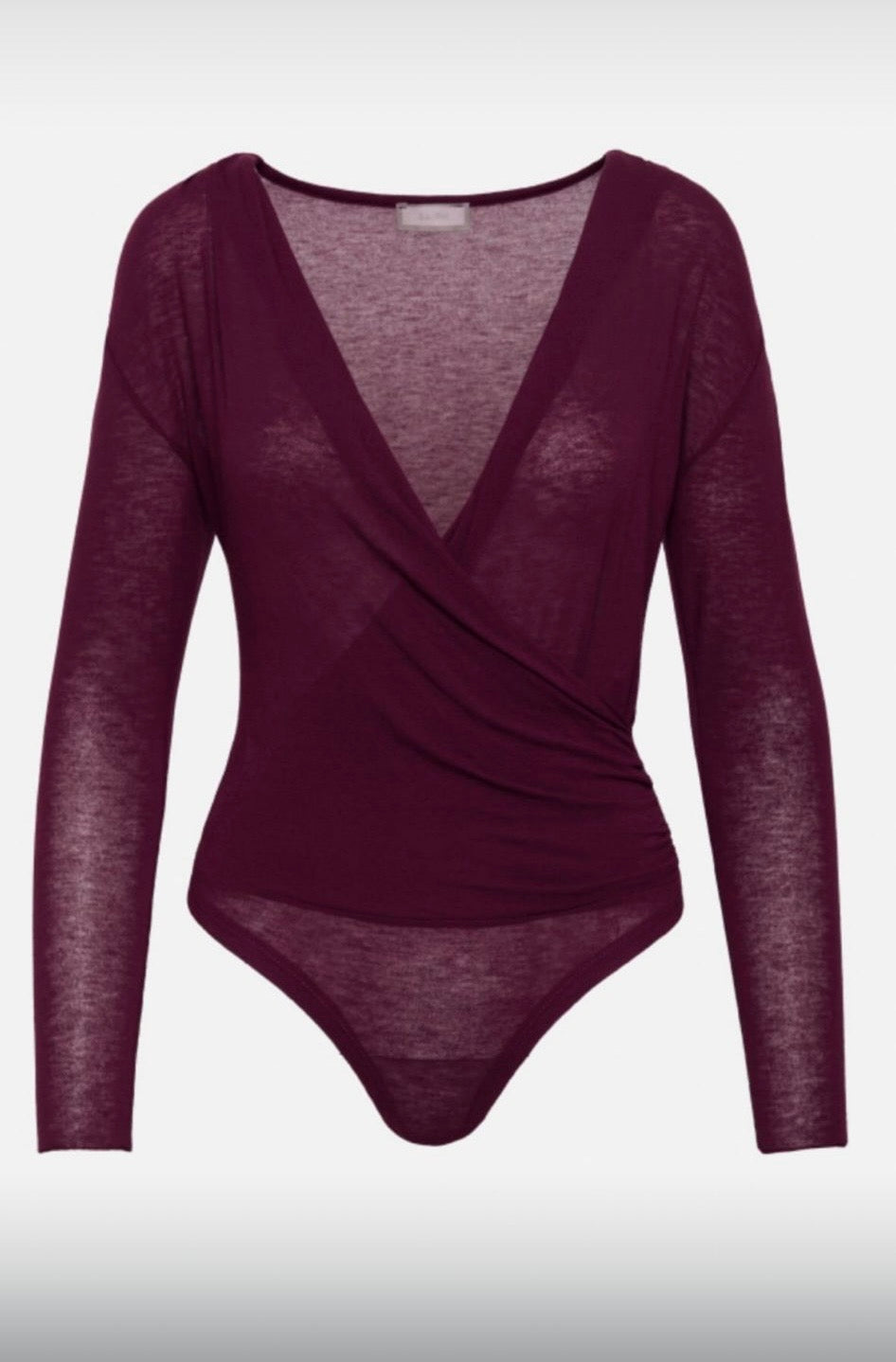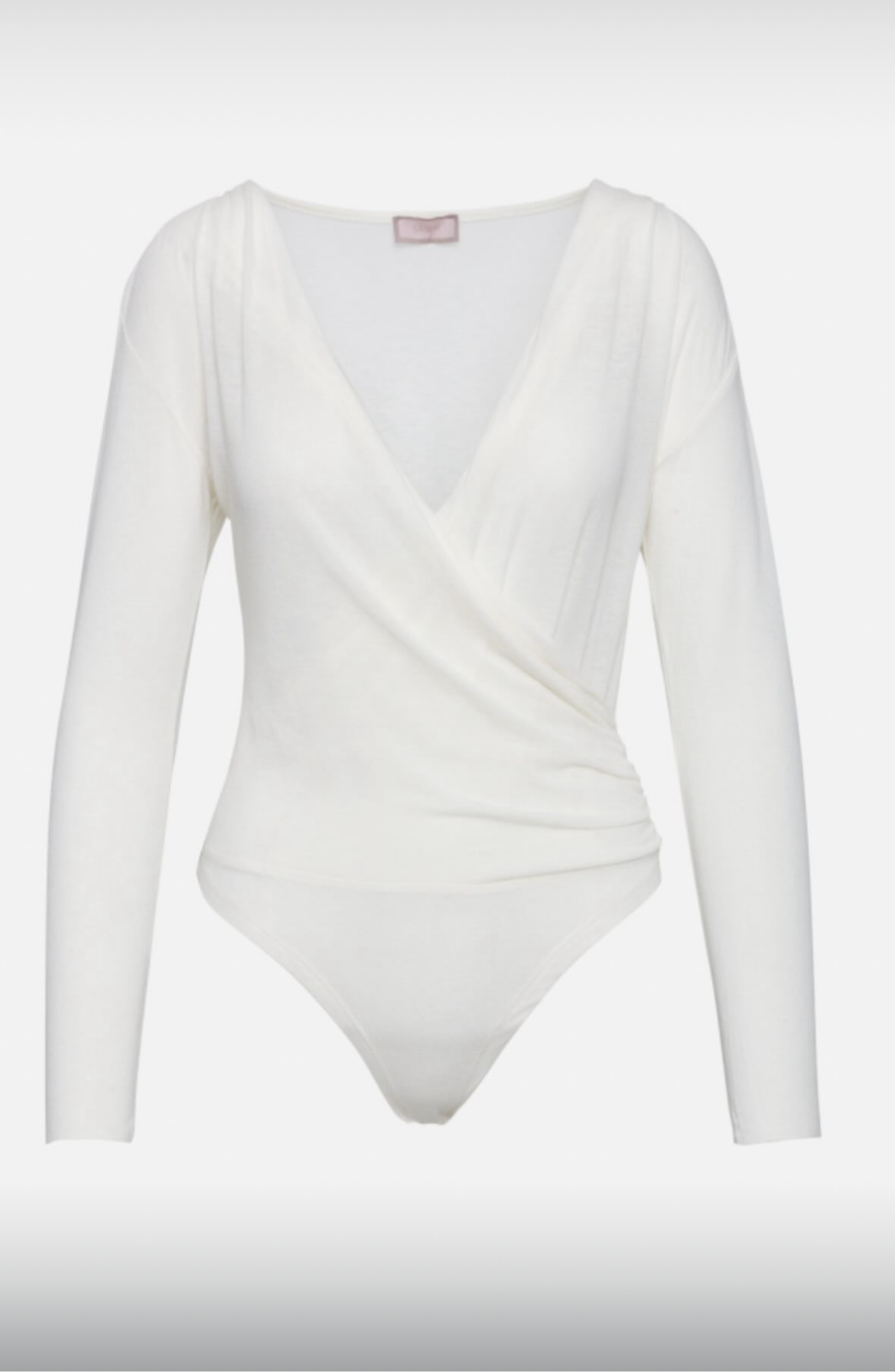 Body taglio vivo in tessuto semitrasparente con ampio scollo ad incrocio e chiusura con gancetti a clip.