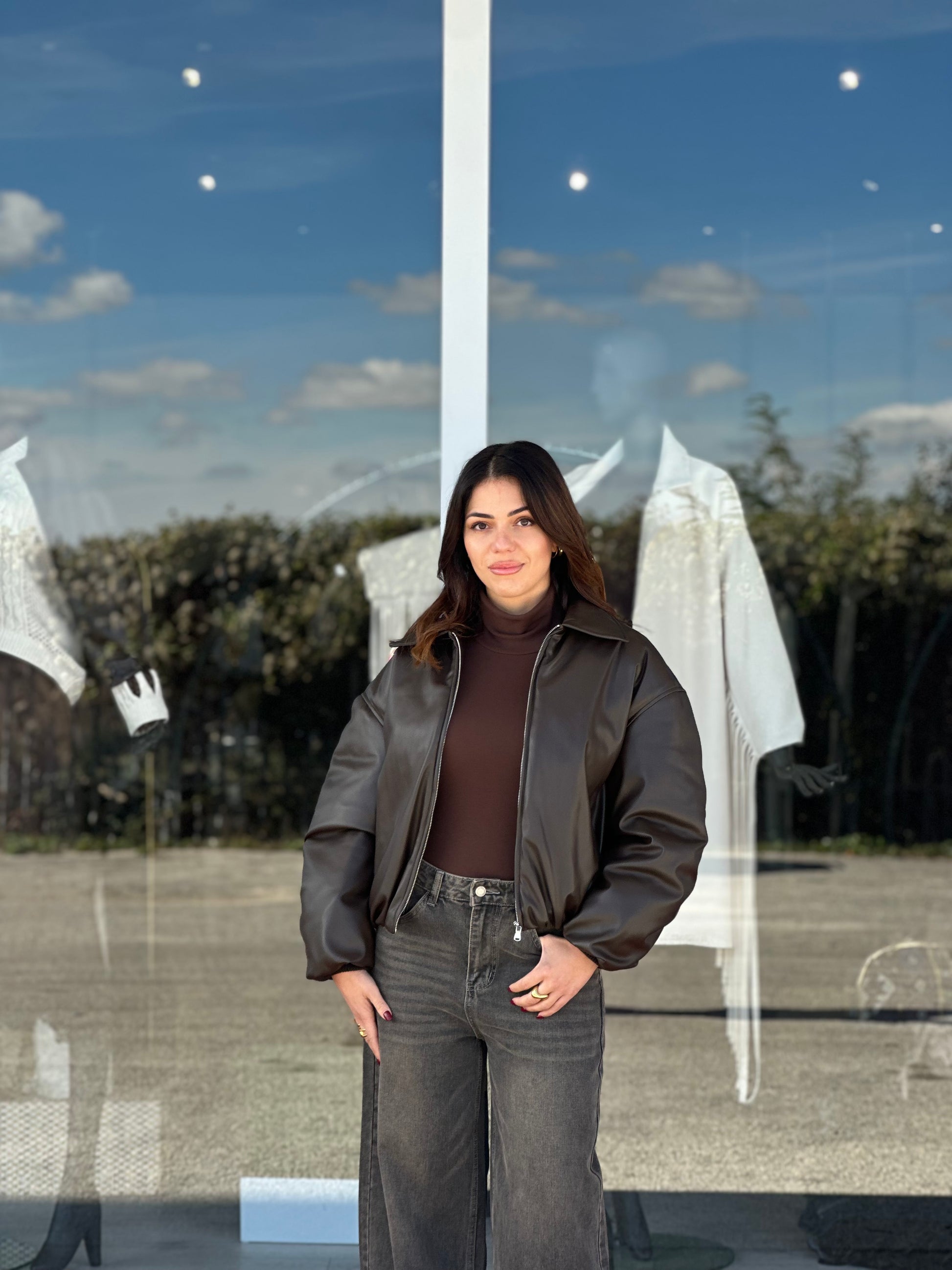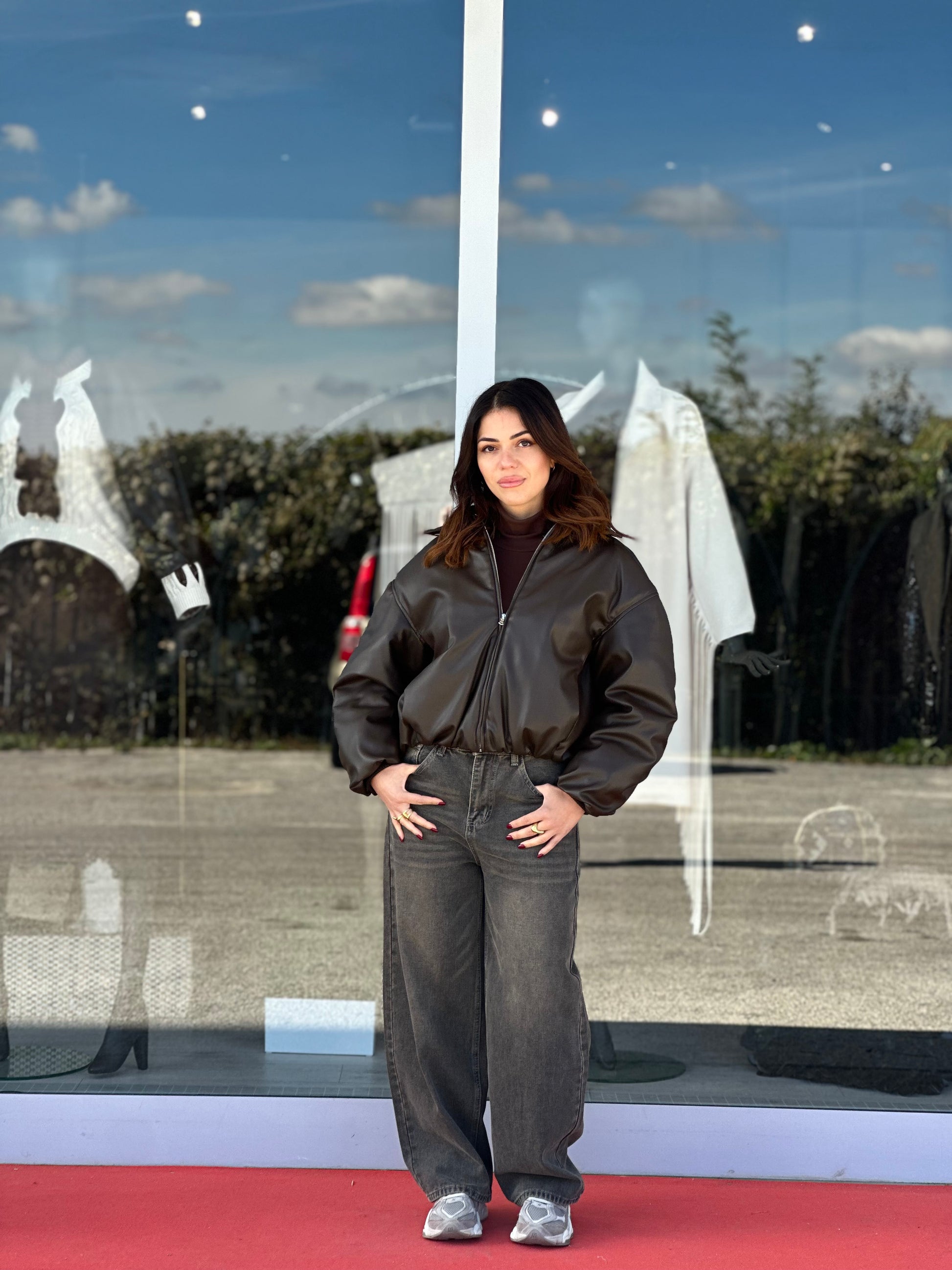 Giacca imbottita modello bomber in ecopelle color testa di moro.