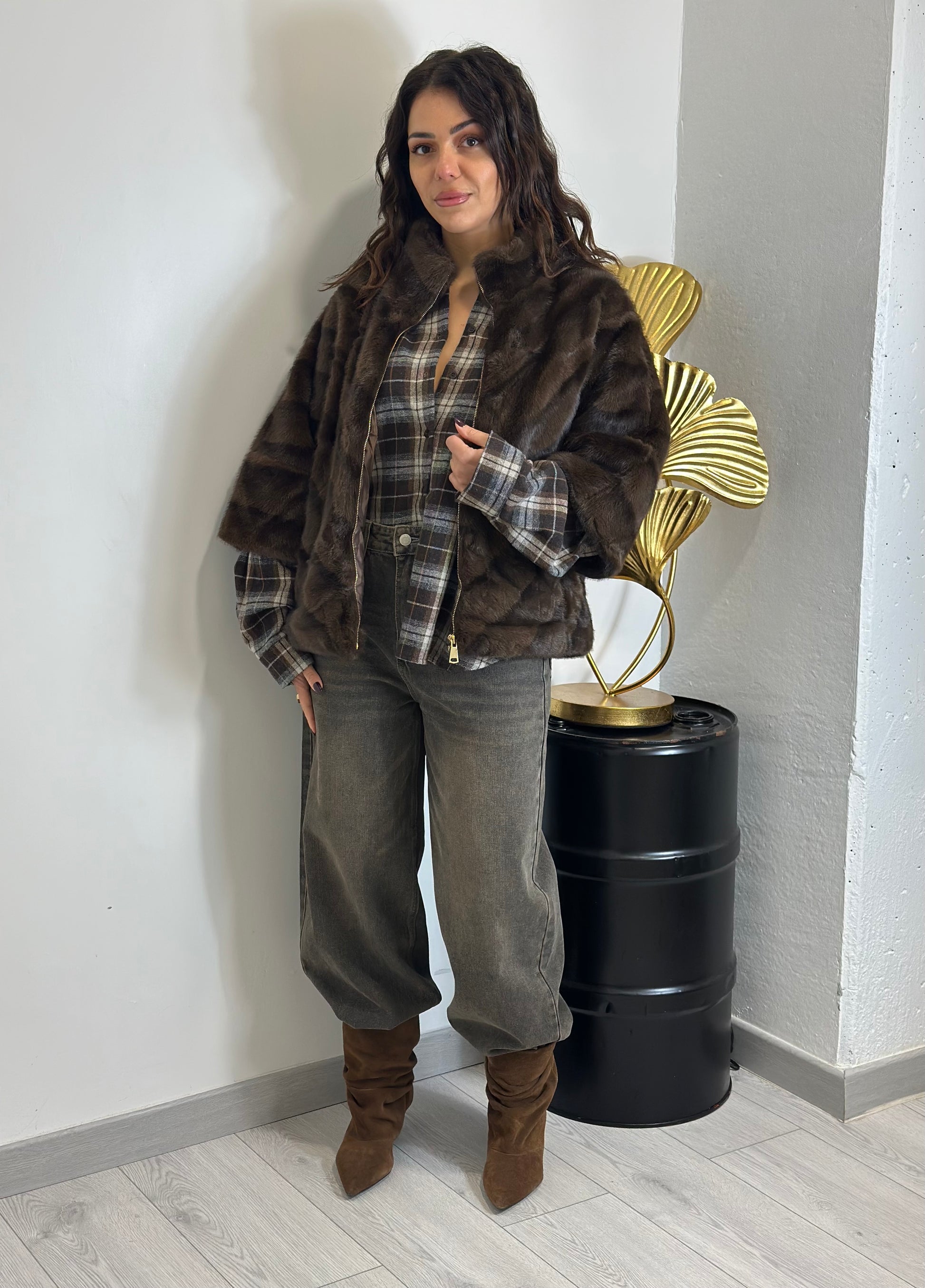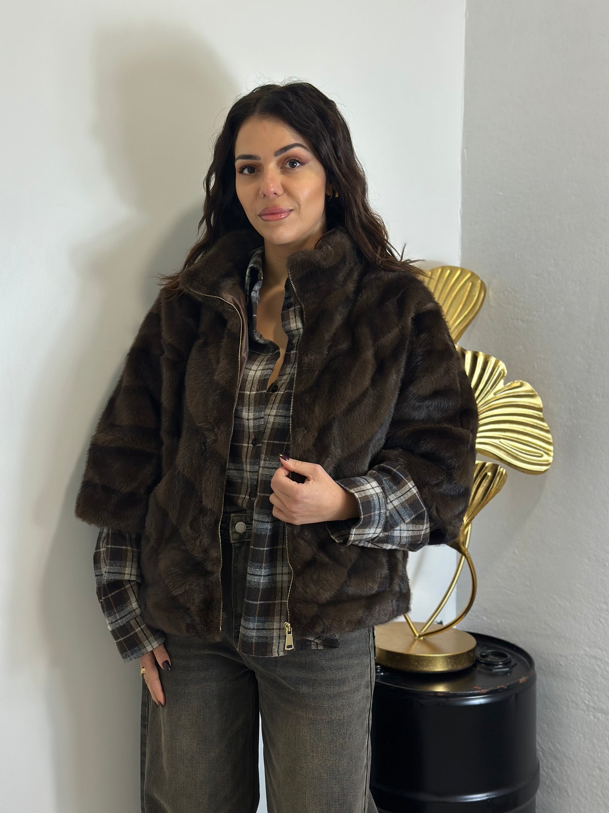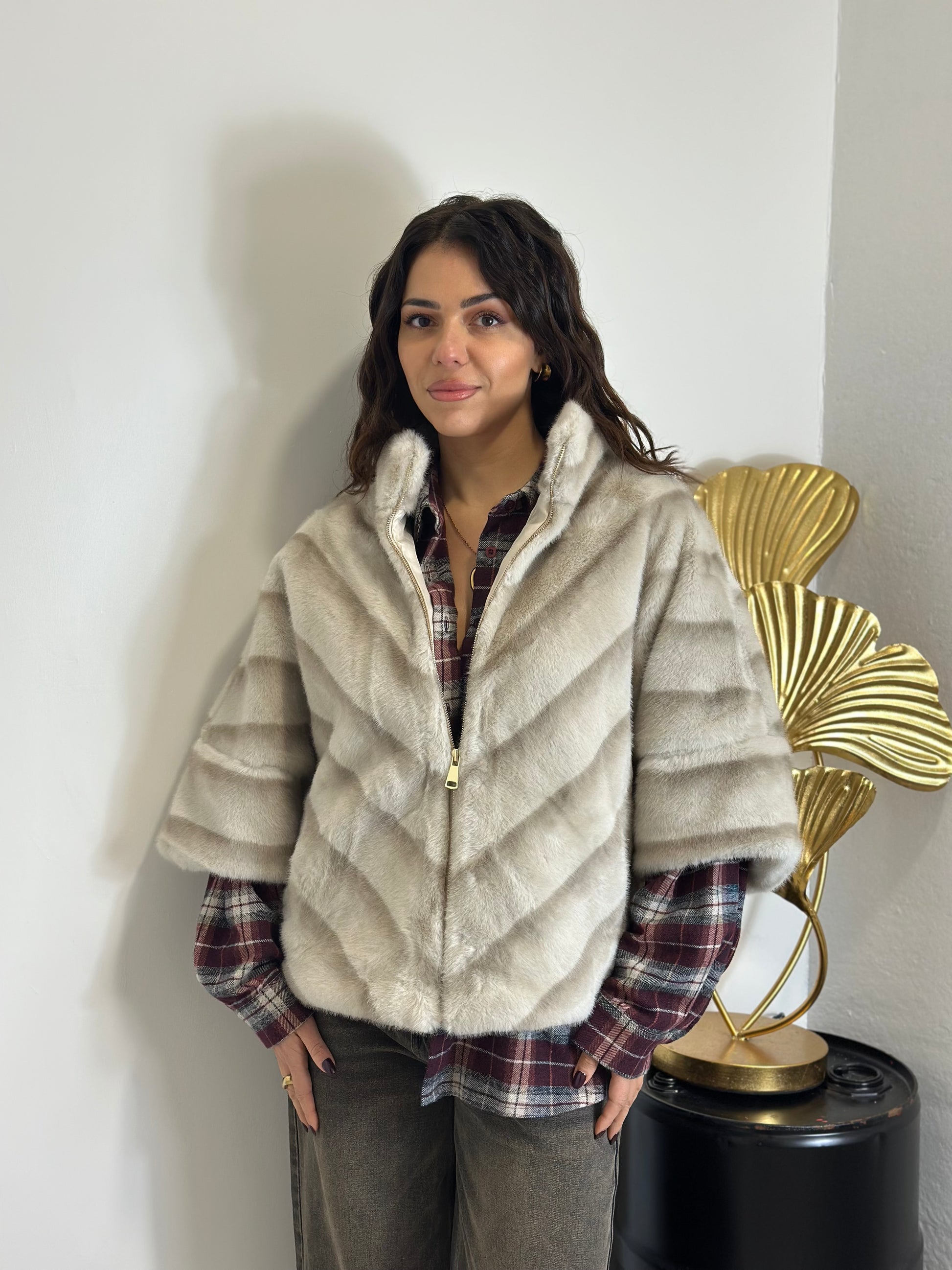 Giacca in ecopelliccia modello visone con manica a 3/4 e chiusura con zip sul davanti.