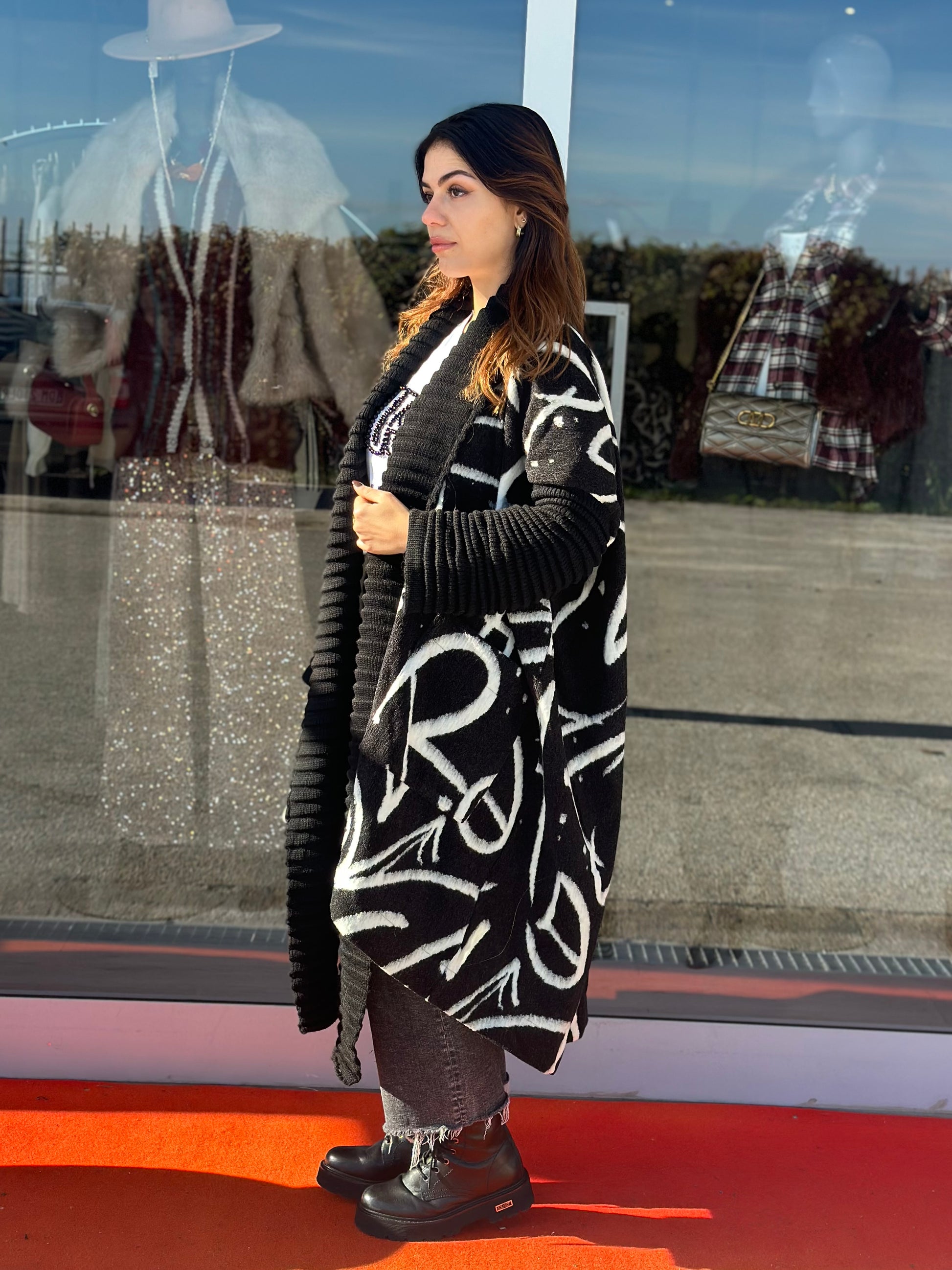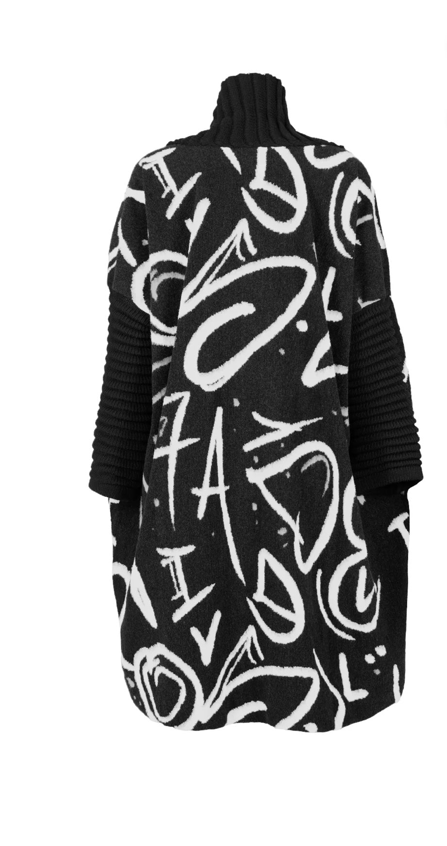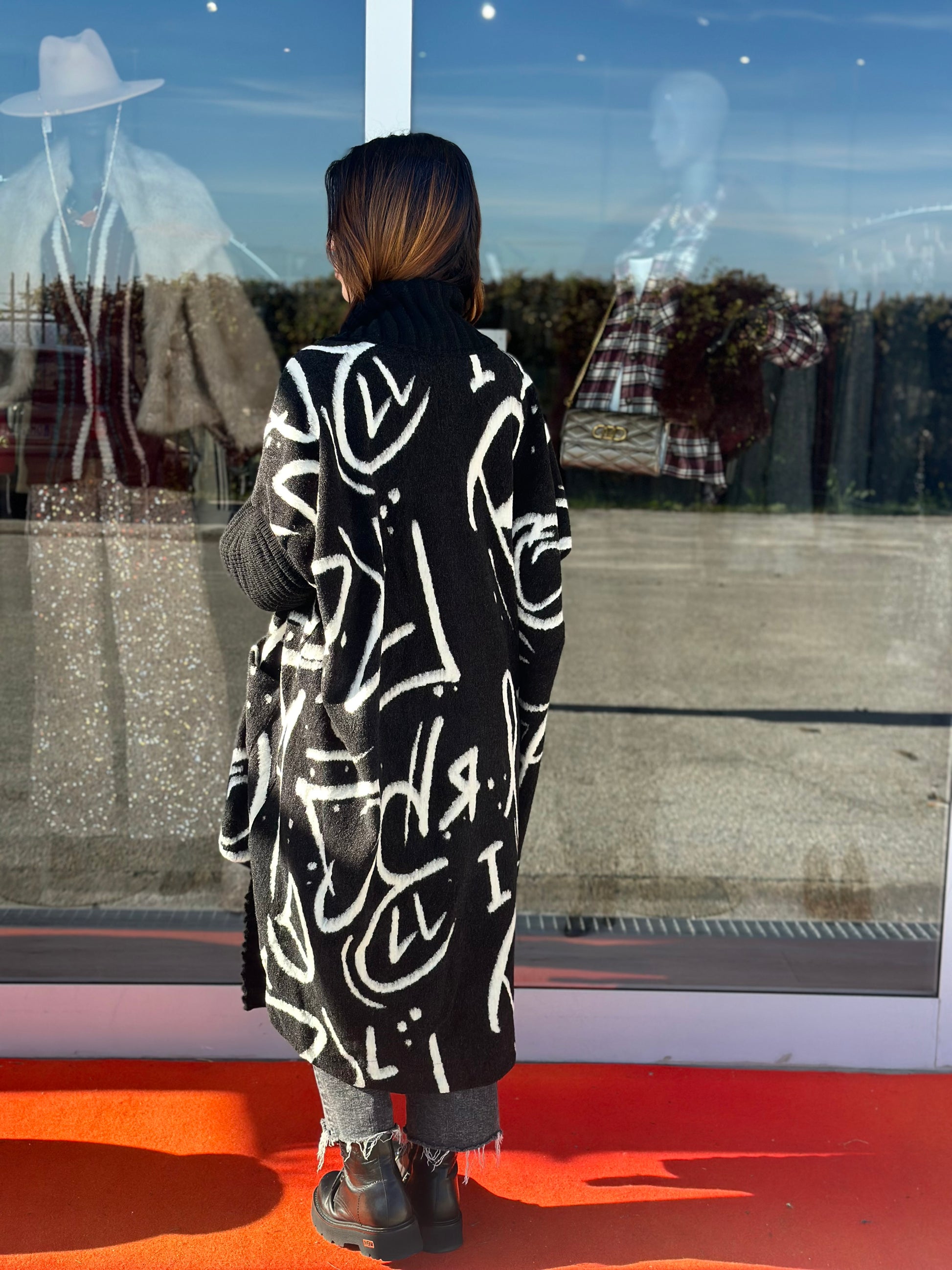 Cappotto lungo dalla particolare fantasia con lettere bianche a contrasto su fondo nero.
