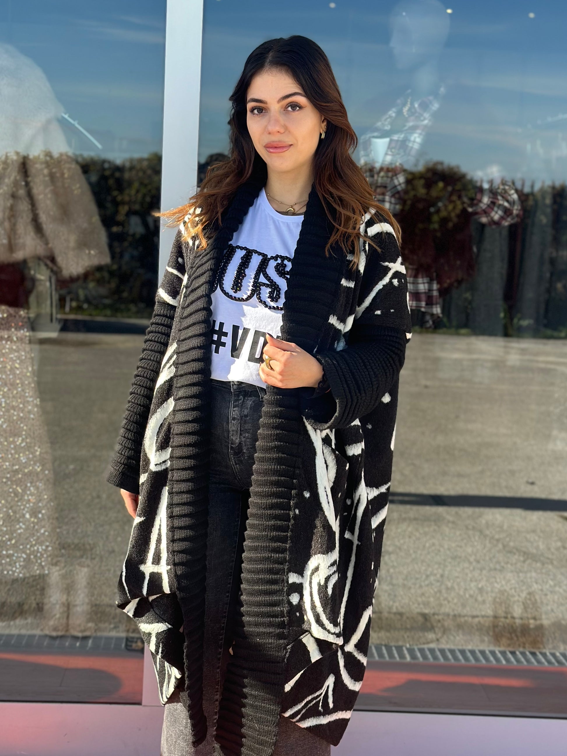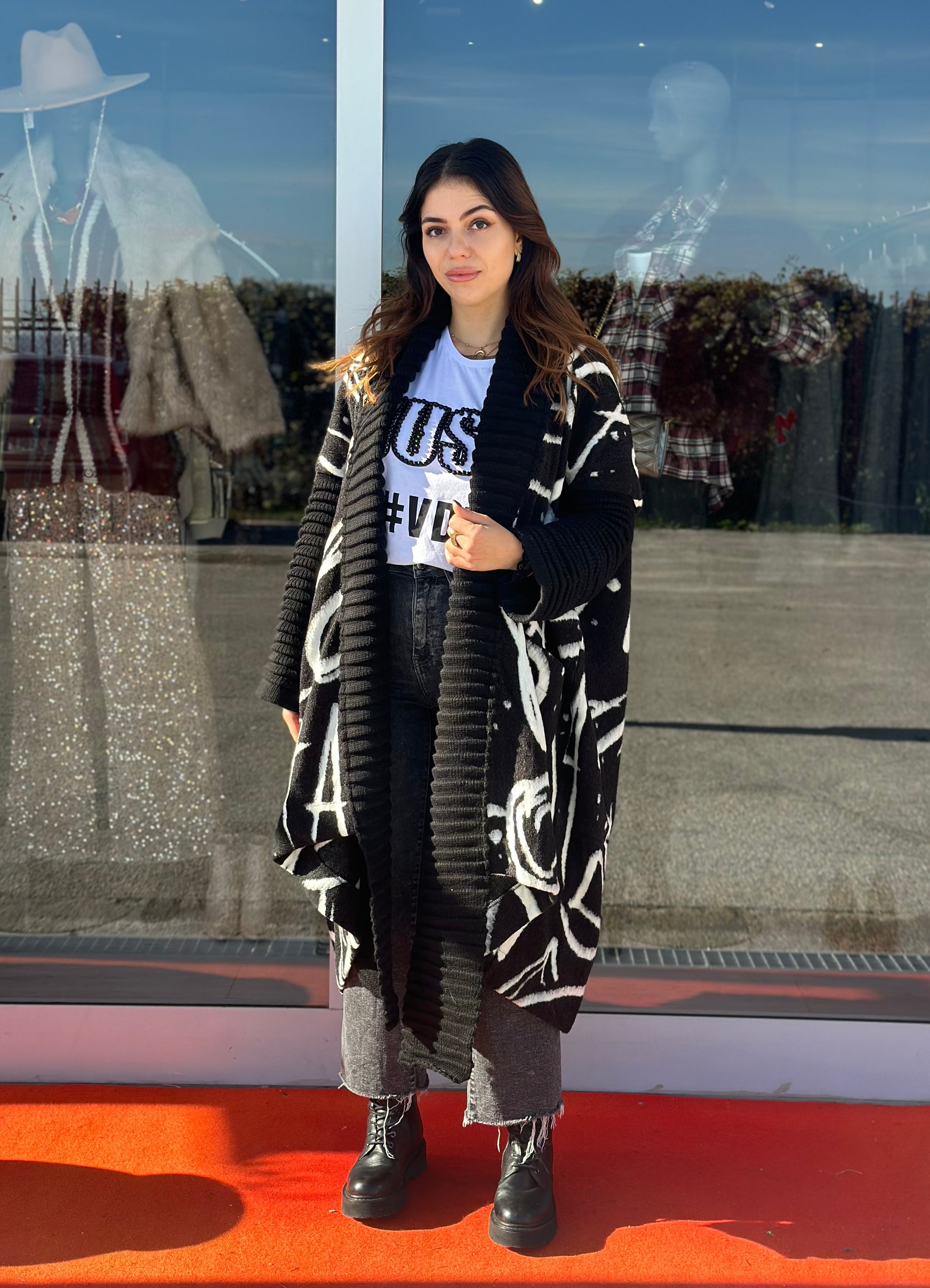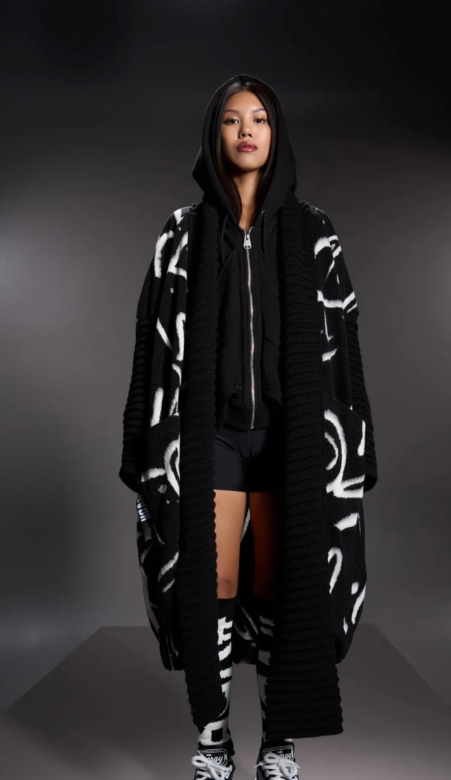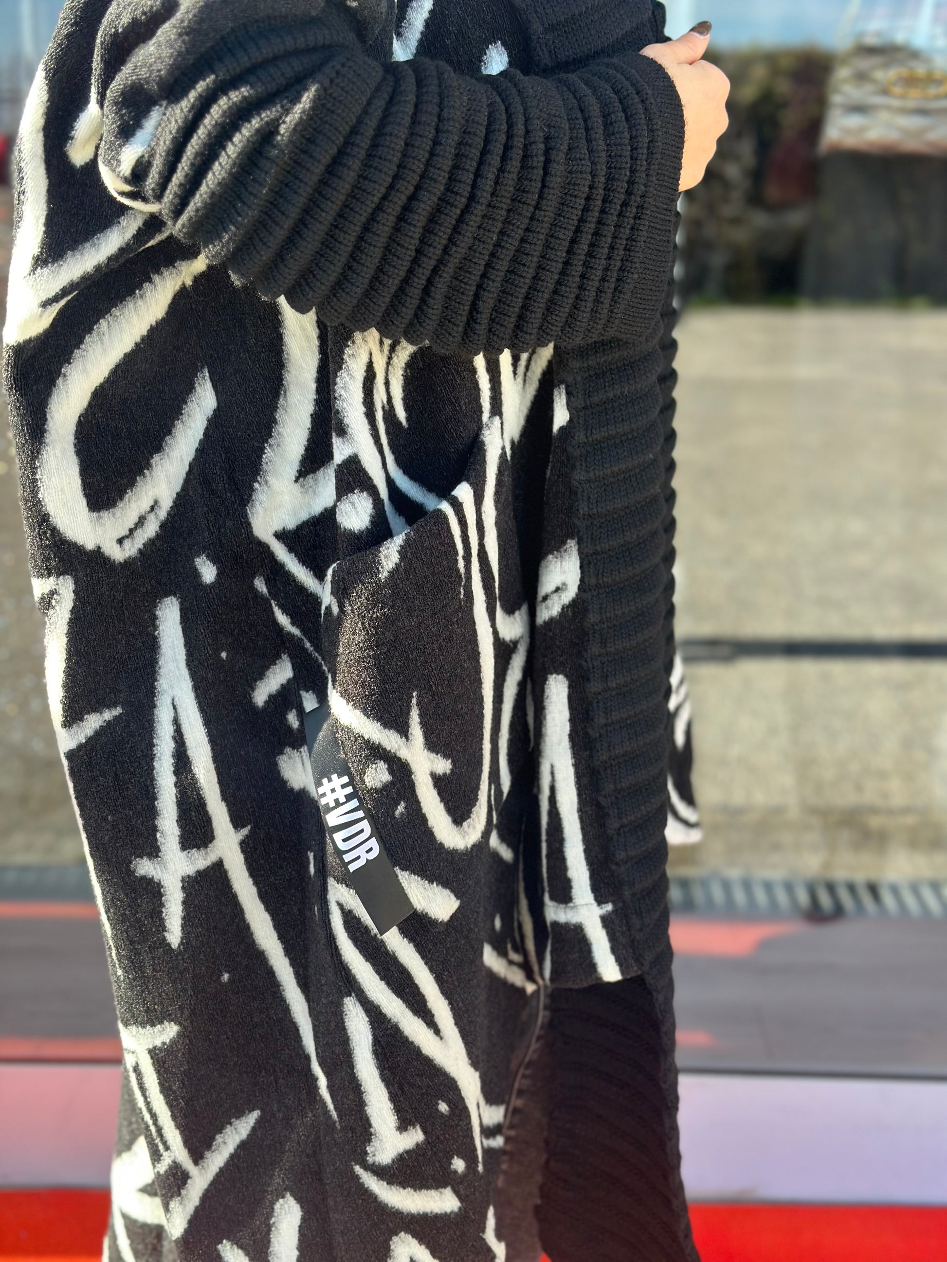 Cappotto lungo dalla particolare fantasia con lettere bianche a contrasto su fondo nero.