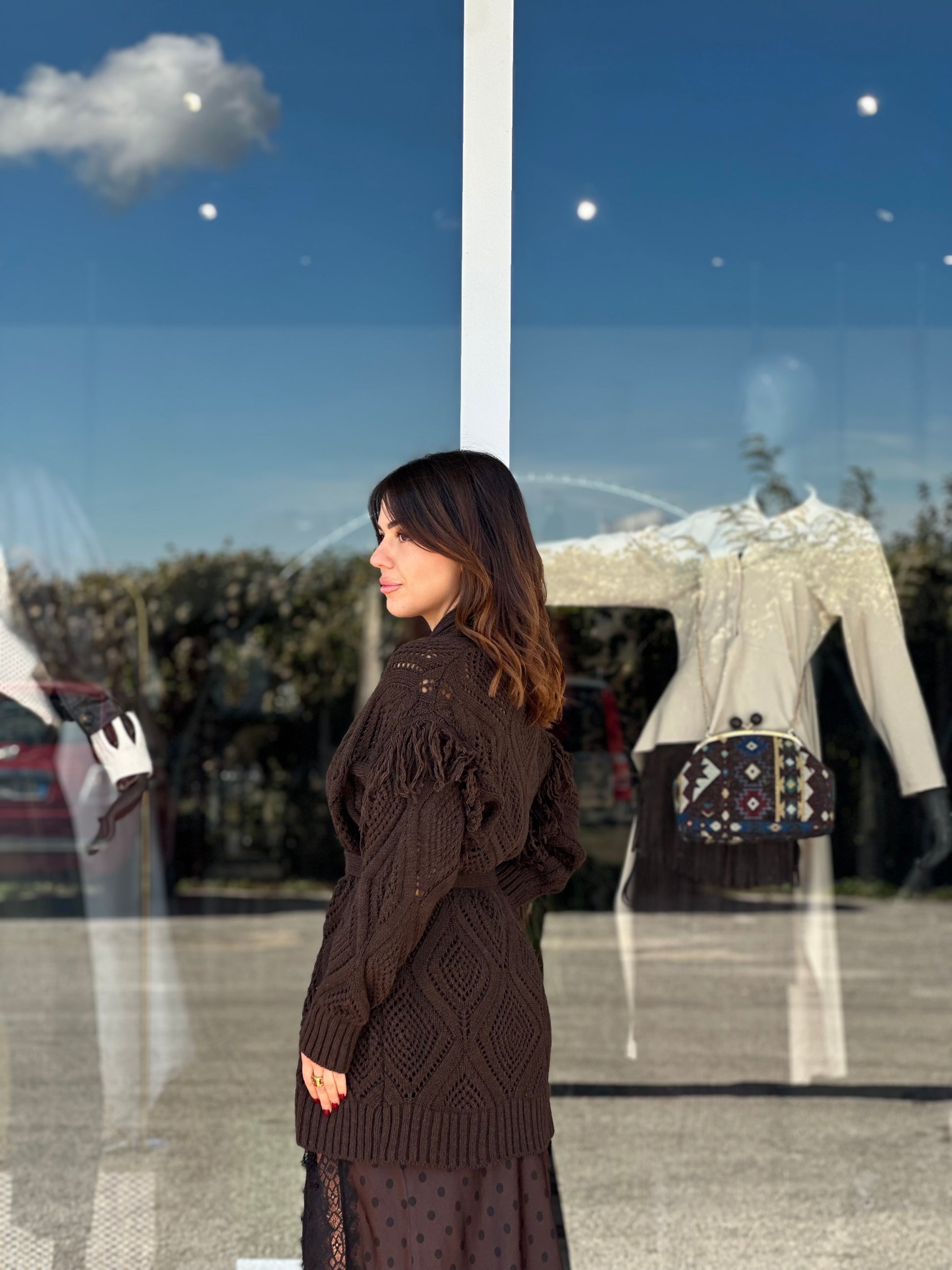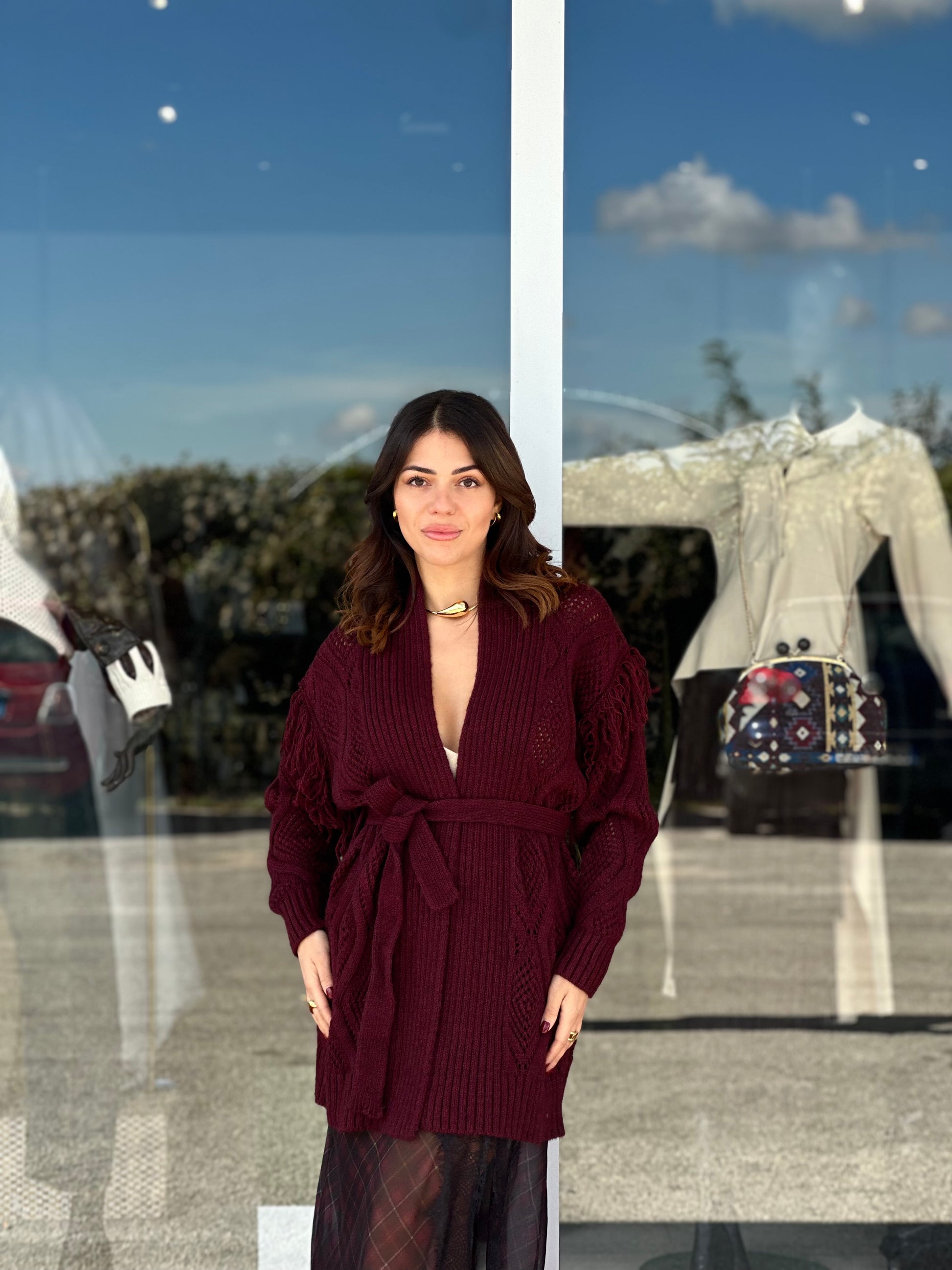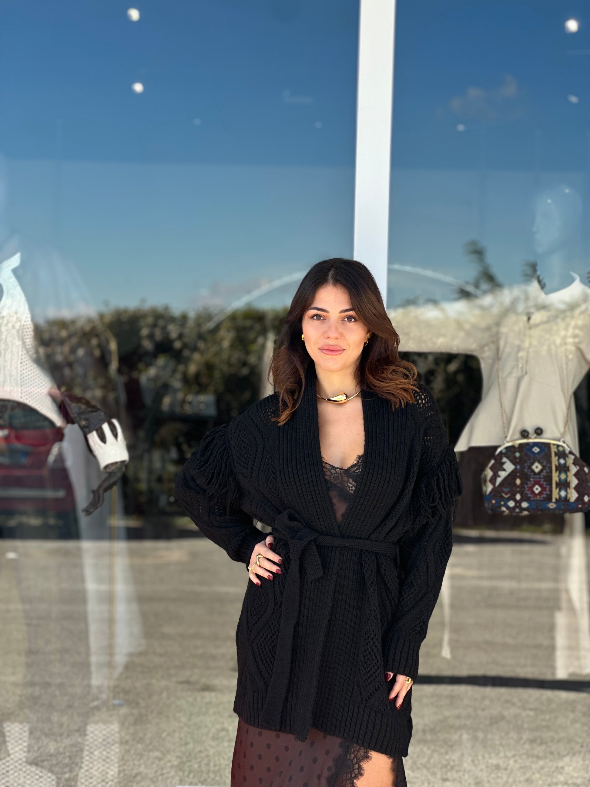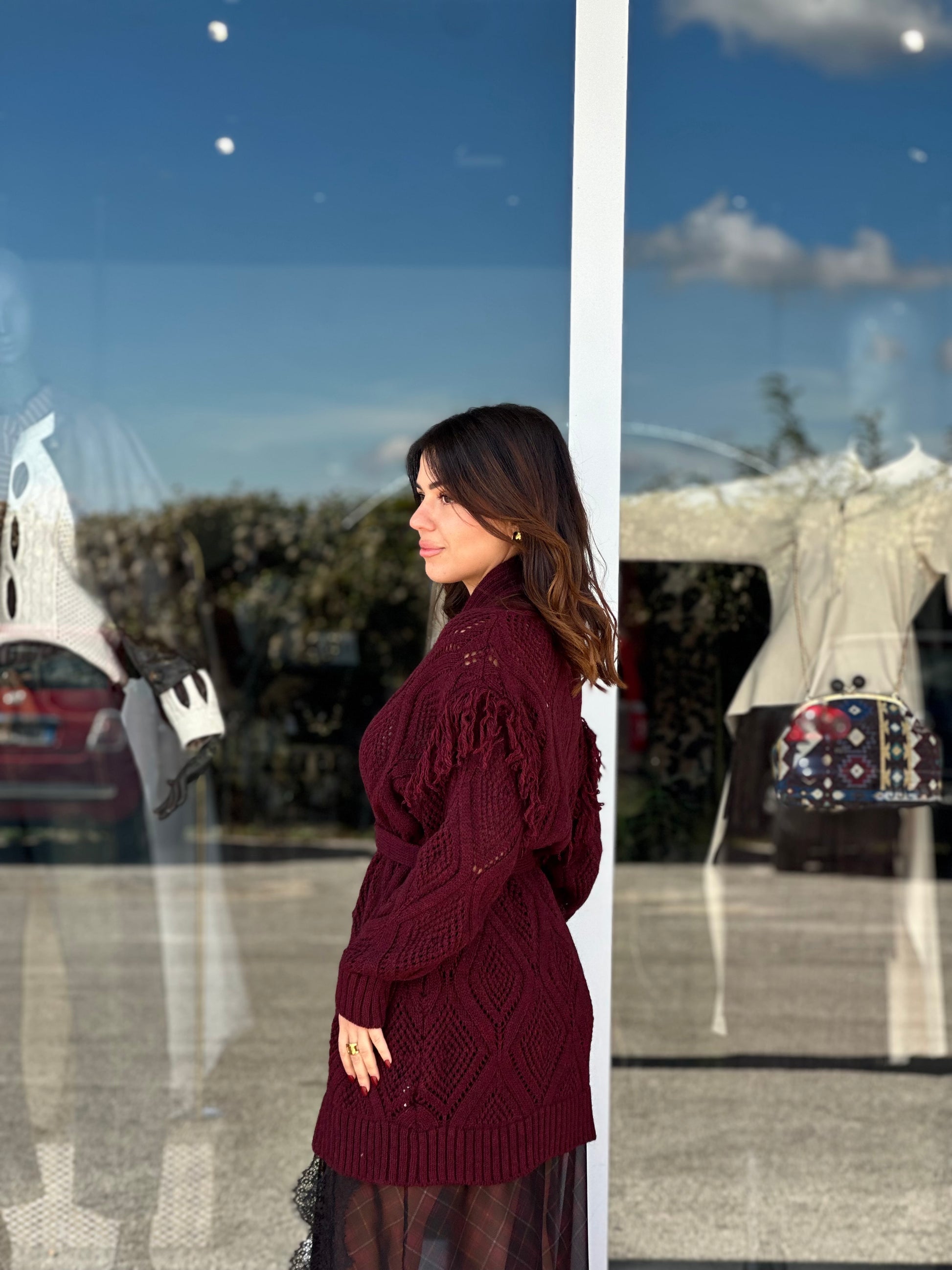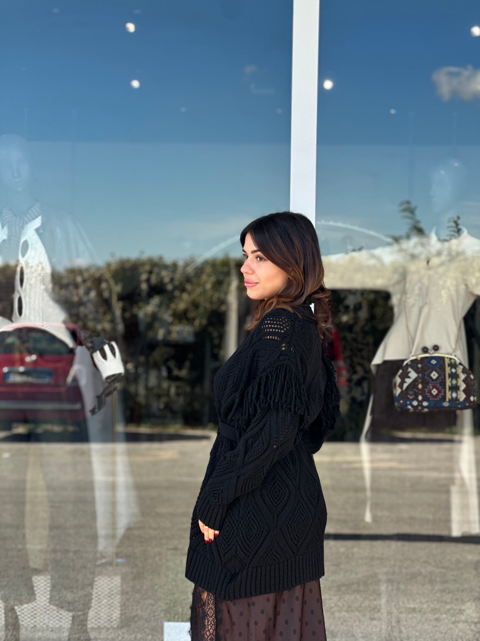 Maxi cardigan traforato con dettaglio frange e cintura in vita.
