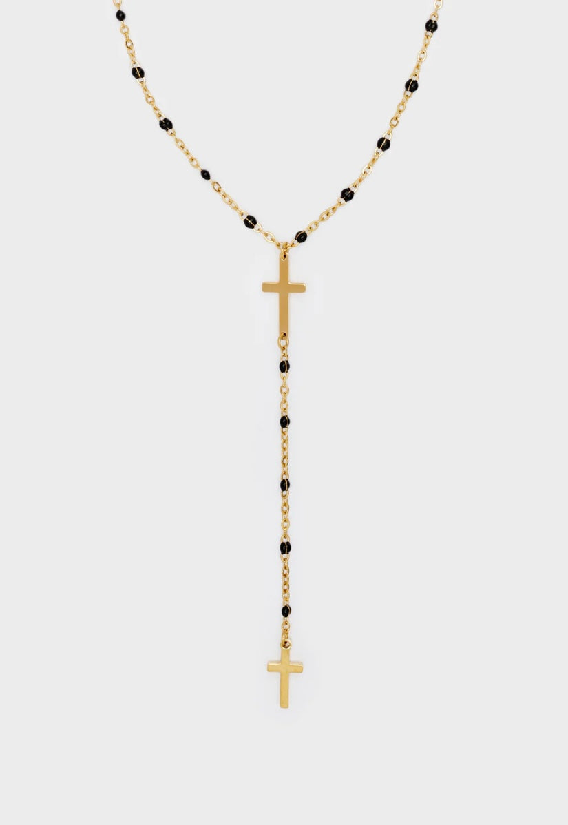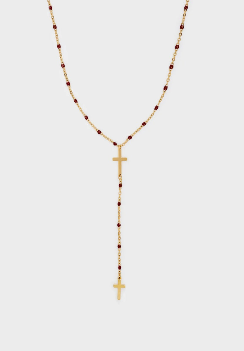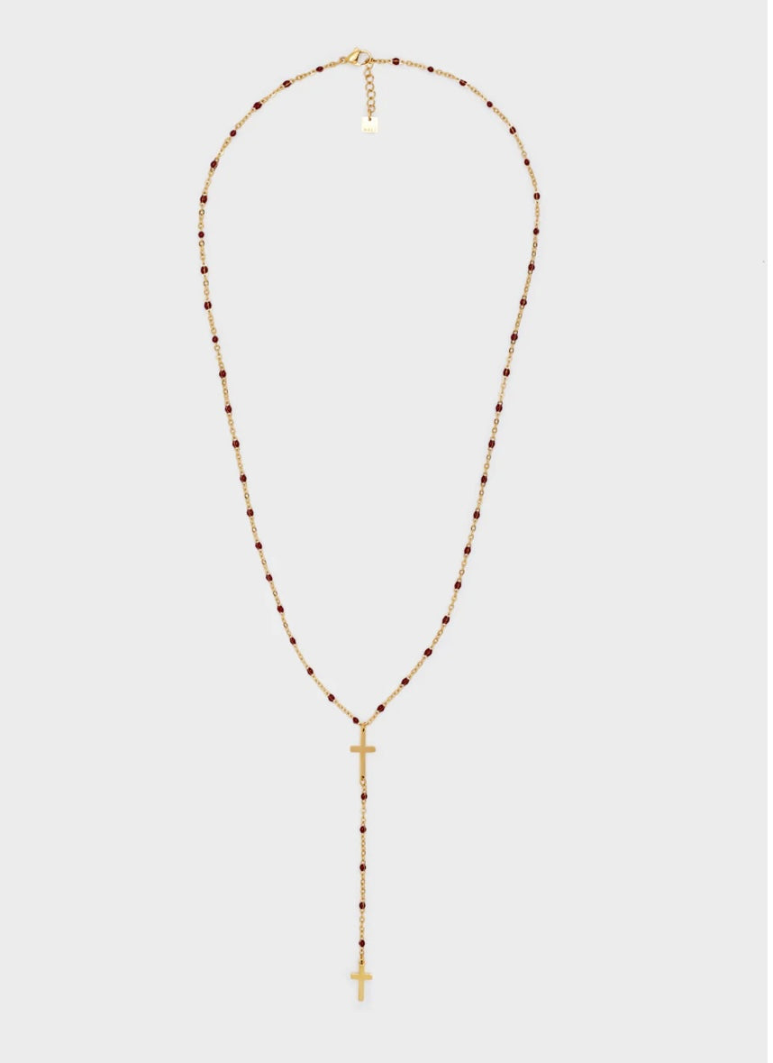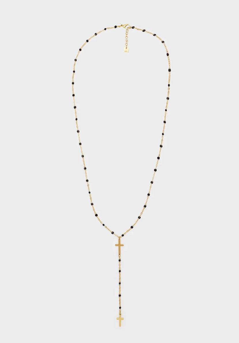 La collana Cross lunga di Nalì si ispirai ai rosari religiosi. È fatta con acciaio inossidabile per garantirle un'alta durabilità nel tempo. È disponibile con perline nere o rosse.