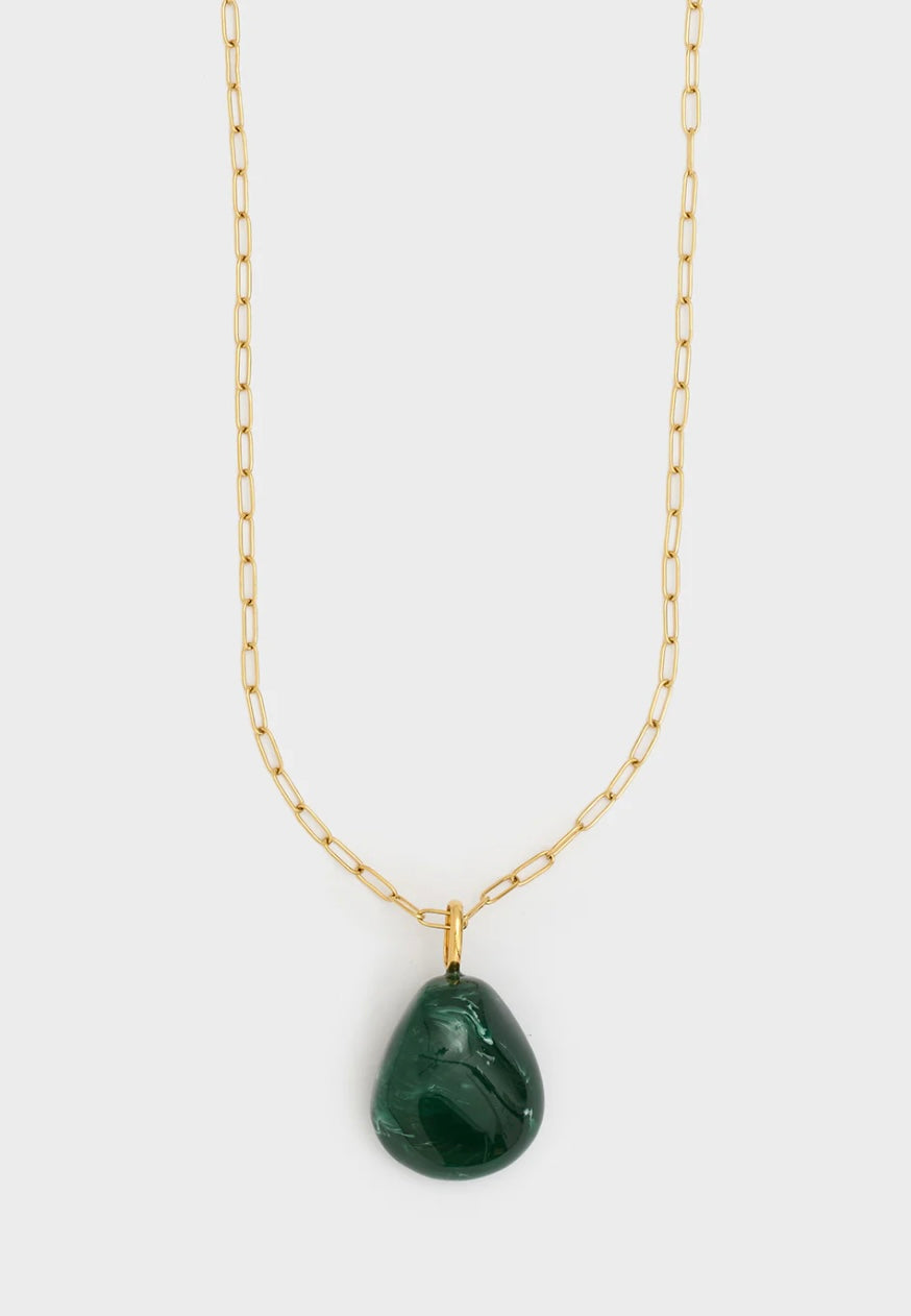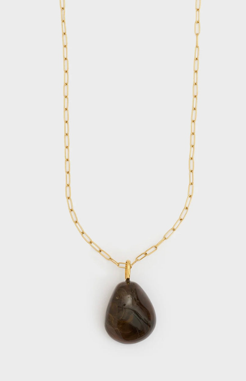 Collana in metallo dorato con catena sottile e pendente in pietra effetto naturale dalle tonalità scure. Un gioiello raffinato che unisce eleganza e un tocco boho-chic.