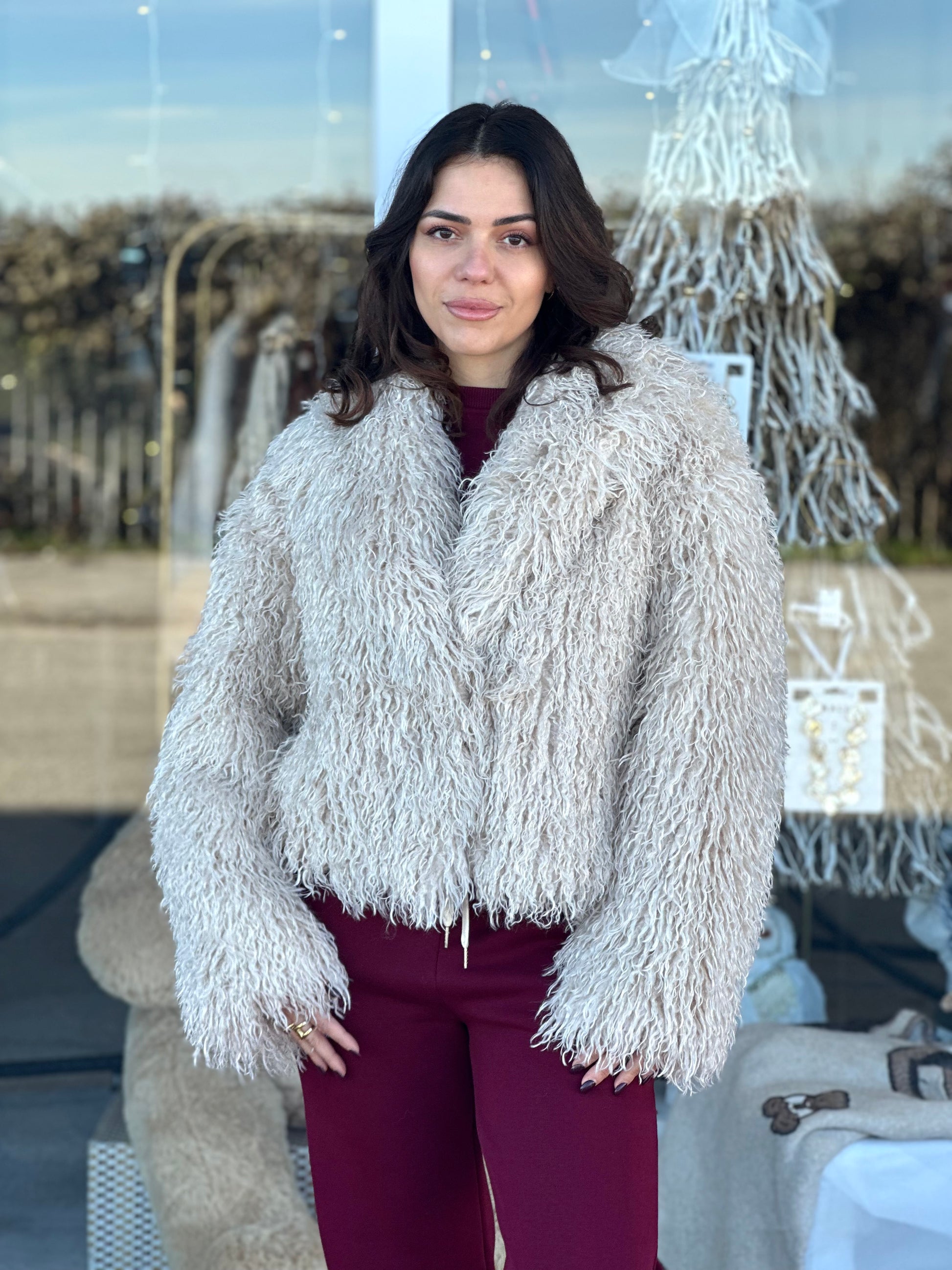 Giacca in ecopelliccia modello mongolia con chiusura con gancetti.