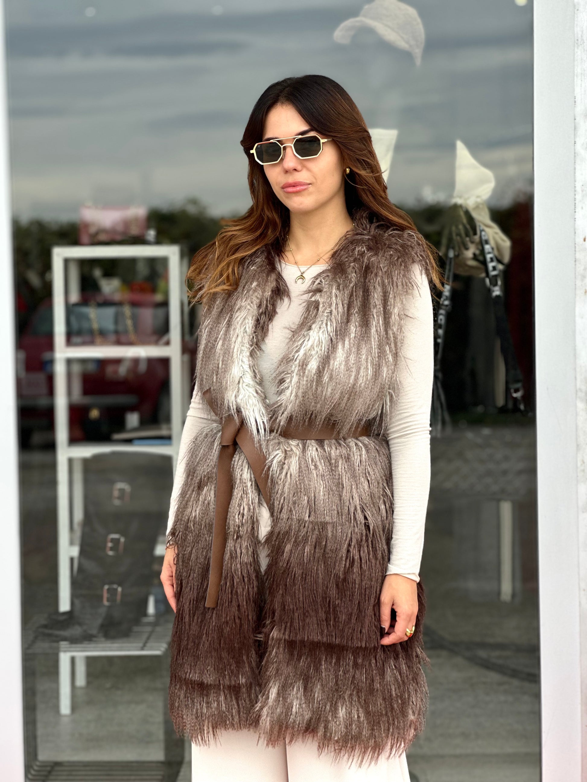 Gilet lungo in ecopelliccia con effetto sfumato e cintura in vita cuoio.