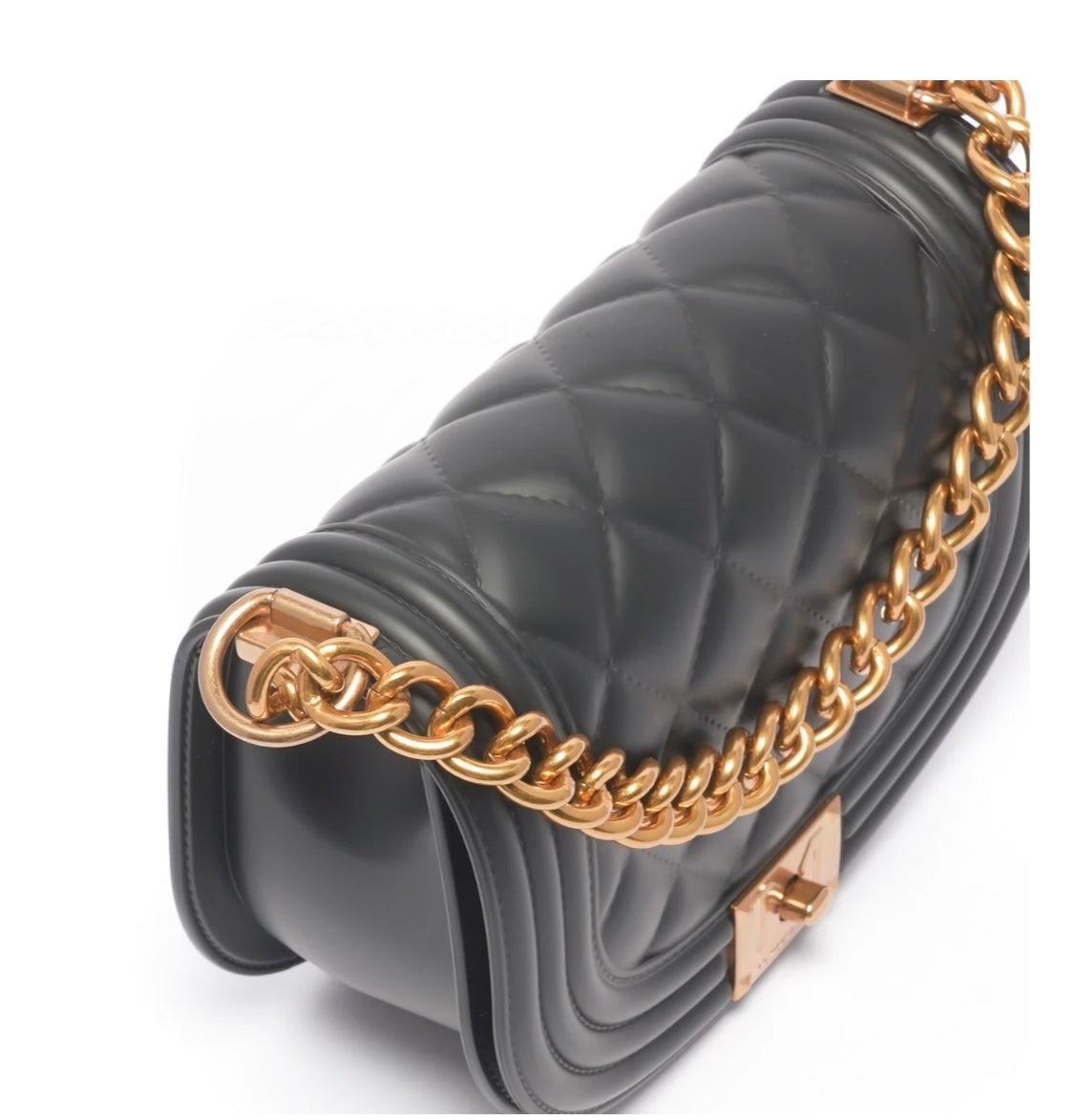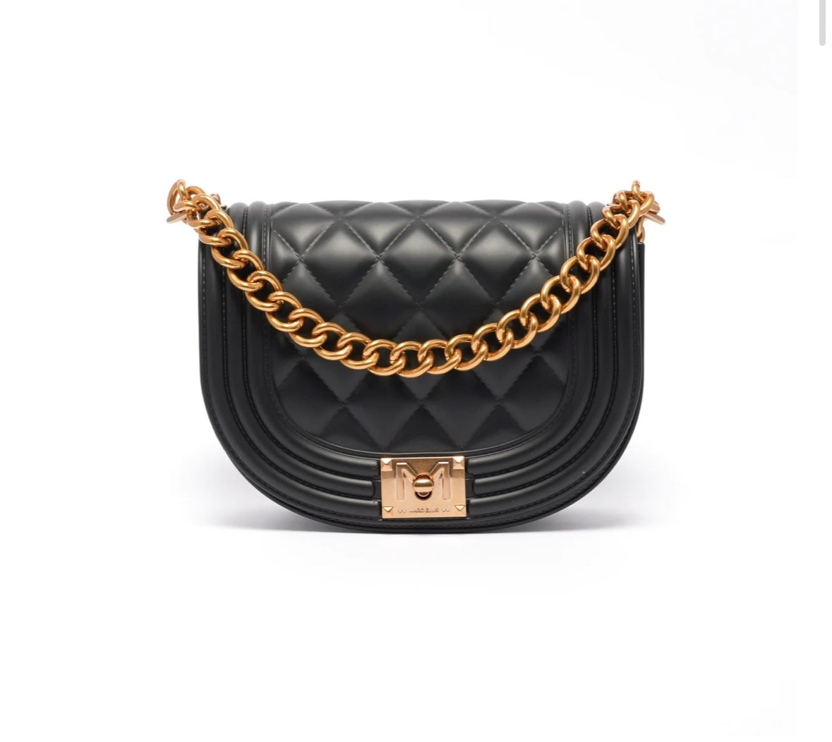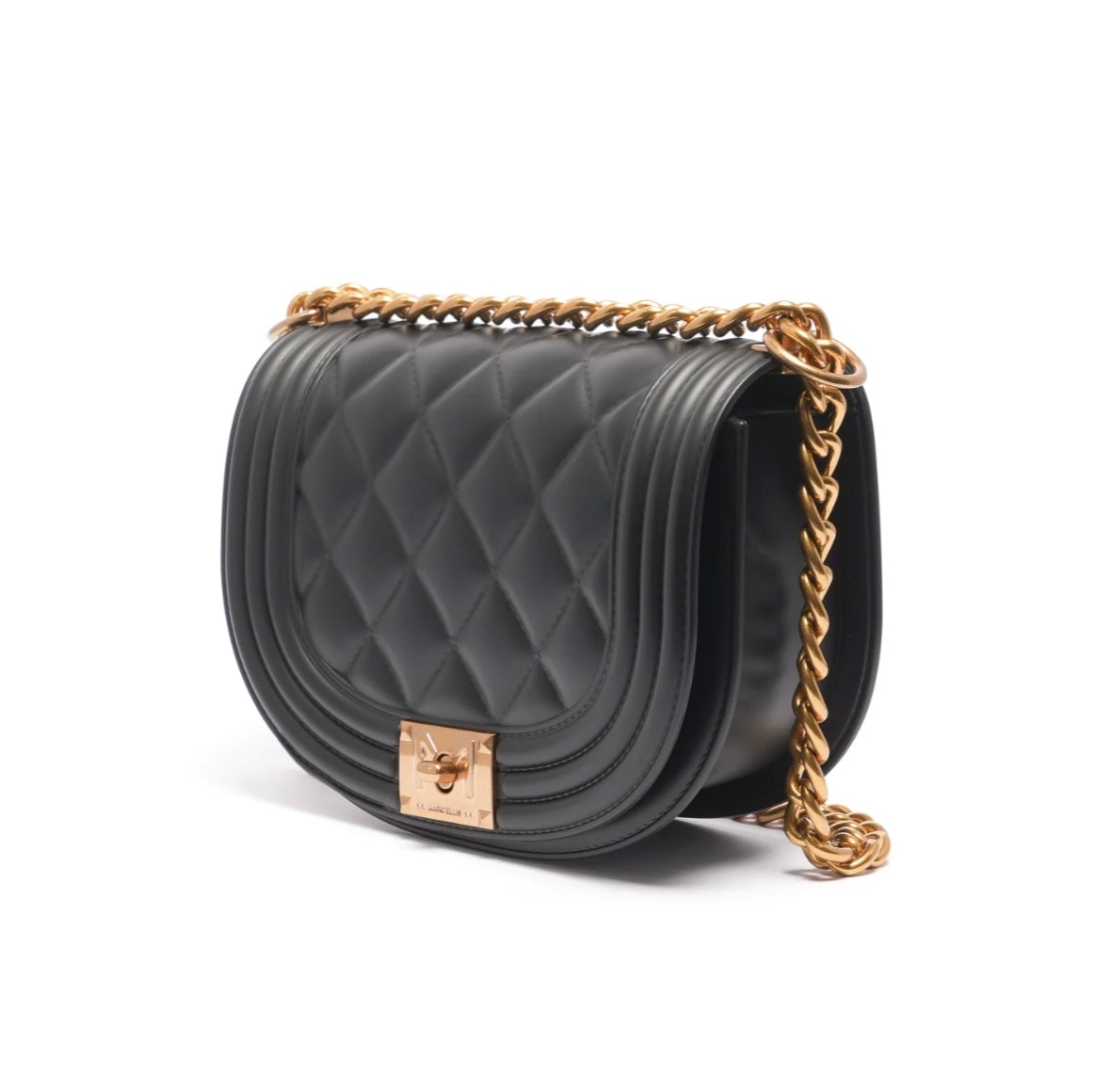 Borsa a tracolla Marc Ellis in gomma effetto trapuntato con forma a sella, modello Flat Zoe black/oro ducale di colore nero e oro. Chiusura a scatto e tracolla a catena.Dimensioni: 15x20x8cm.